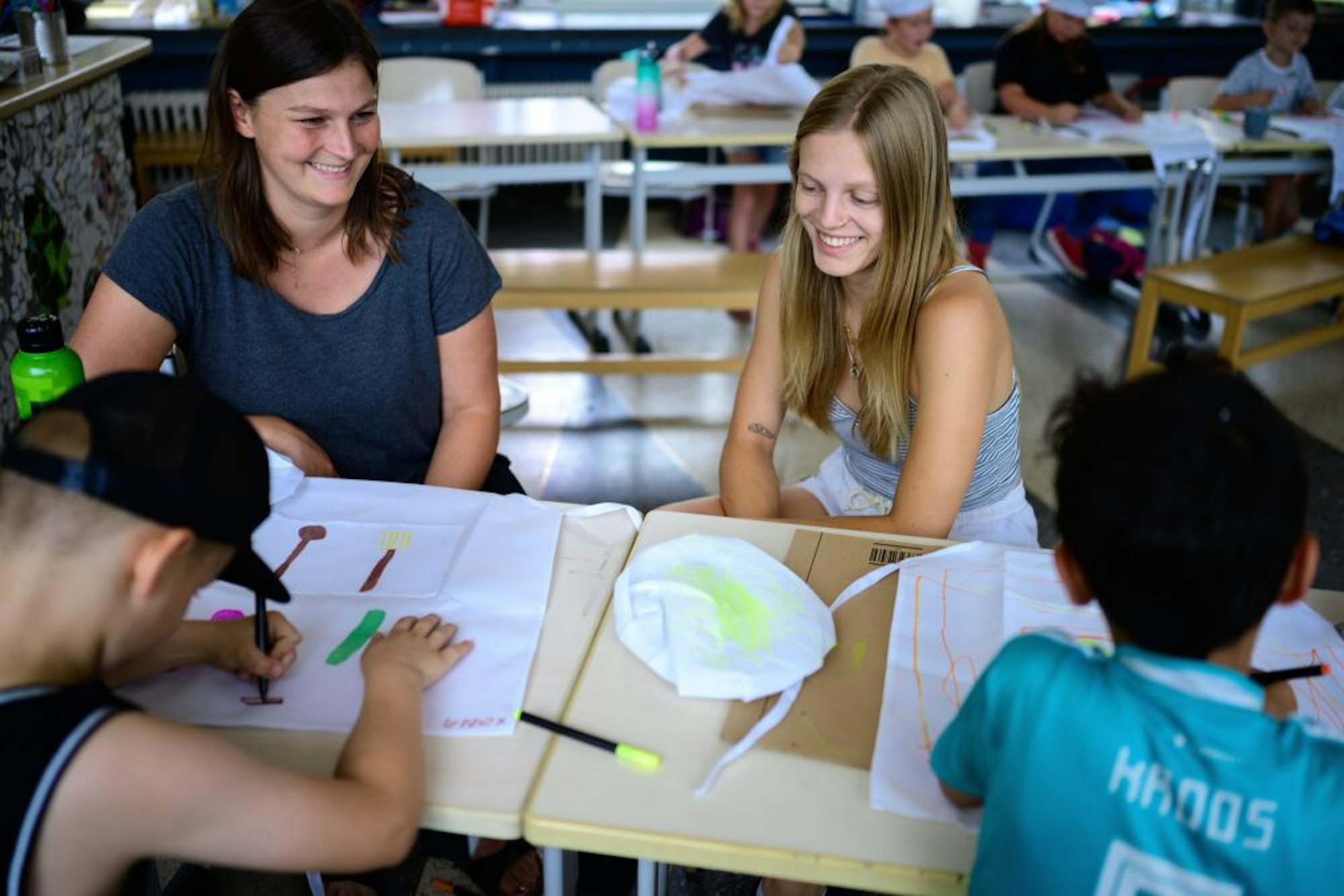 Köln – „Schule in den Ferien ist schööön“, sagt Emely (7) und bemalt ihre weiße Schürze mit Bananen, Tomaten und anderen Motiven rund ums Thema Kochen. Auch die anderen neun Kinder starten mit neuen Koch-Utensilien in die Woche zum „Corona-Aufholprogramm“ an der Gemeinschaftsgrundschule Weimarer Straße. Während viele Pänz noch mit ihren Familien in den Sommerferien sind, besuchen etliche schon längst wieder Angebote in Schulen. Eine Gruppe in der Höhenberger GGS macht sich Gedanken über Traumberufe. „Tiktokarin“ oder „Youtuberin“, Architekt, Gamer oder doch „Michanikerin“?