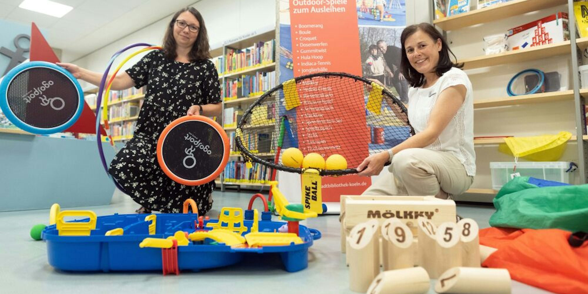 Ausleihen erwünscht: Miriam Wigger und Pamela Baber (v.l.) zeigen einen Teil der Spiele für draußen.