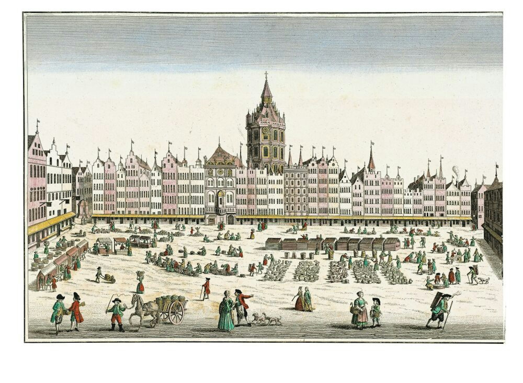 Handel auf dem Alter Markt: Der kolorierte Kupferstich (1750) von Georg Balthasar Probst orientiert sich an einem mehr als 100 Jahre älteren Motiv.