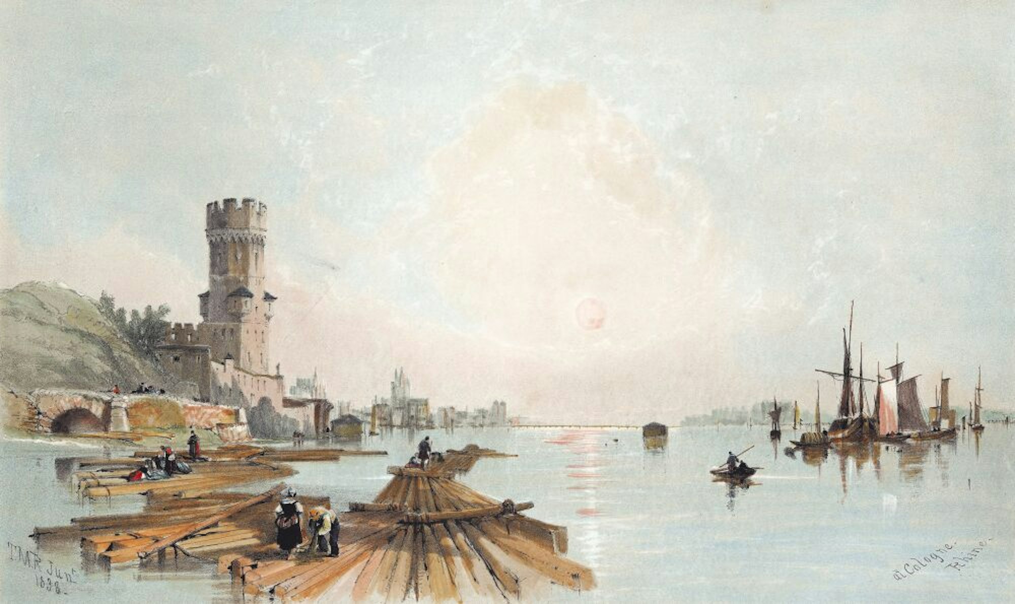 Der Bayenturm und der Rhein als prägende Ansichten: Flößer am Fluss. Thomas Miles Richardson, 1838.