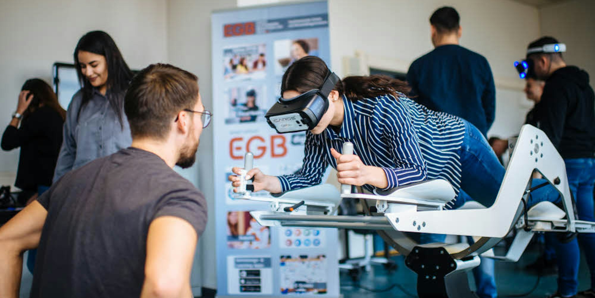 Wie vielseitig das digitale Angebot am EGB ist, demonstrierten die Schüler im E-Sports-Unterricht. Mithilfe von Virtual Reality-Brillen tauchten sie durch virtuelle Ringe unter Wasser oder bugsierten virtuelle Kopfbälle ins Tor. Eine Schülerin: „Man vergisst, wo man ist und denkt viel mehr über seine Handlungen nach“. (ebu)