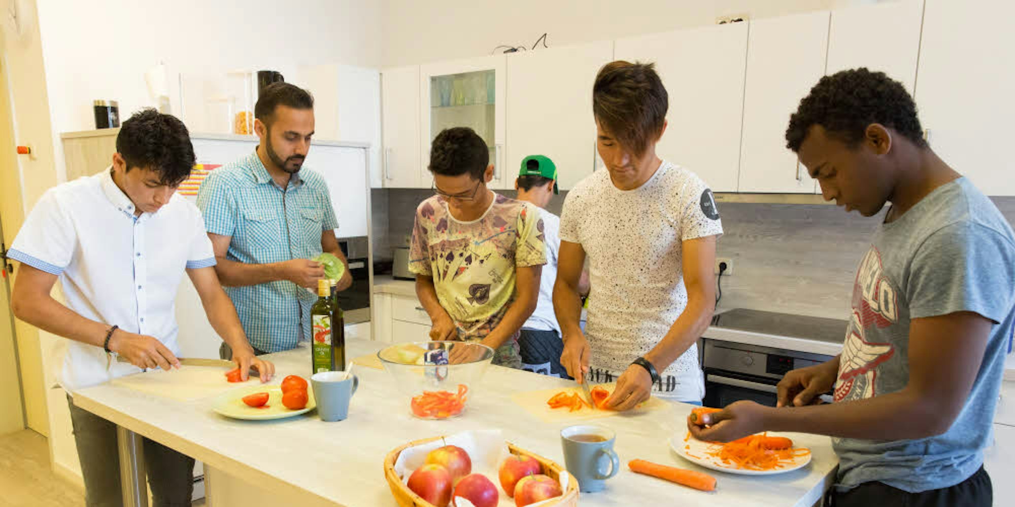 Gemeinsam kochen und essen ist ein festes Ritual in der Wohngruppe. Betreuer Spinghar Safi (2.v.l.) leistet gerne Hilfestellung.
