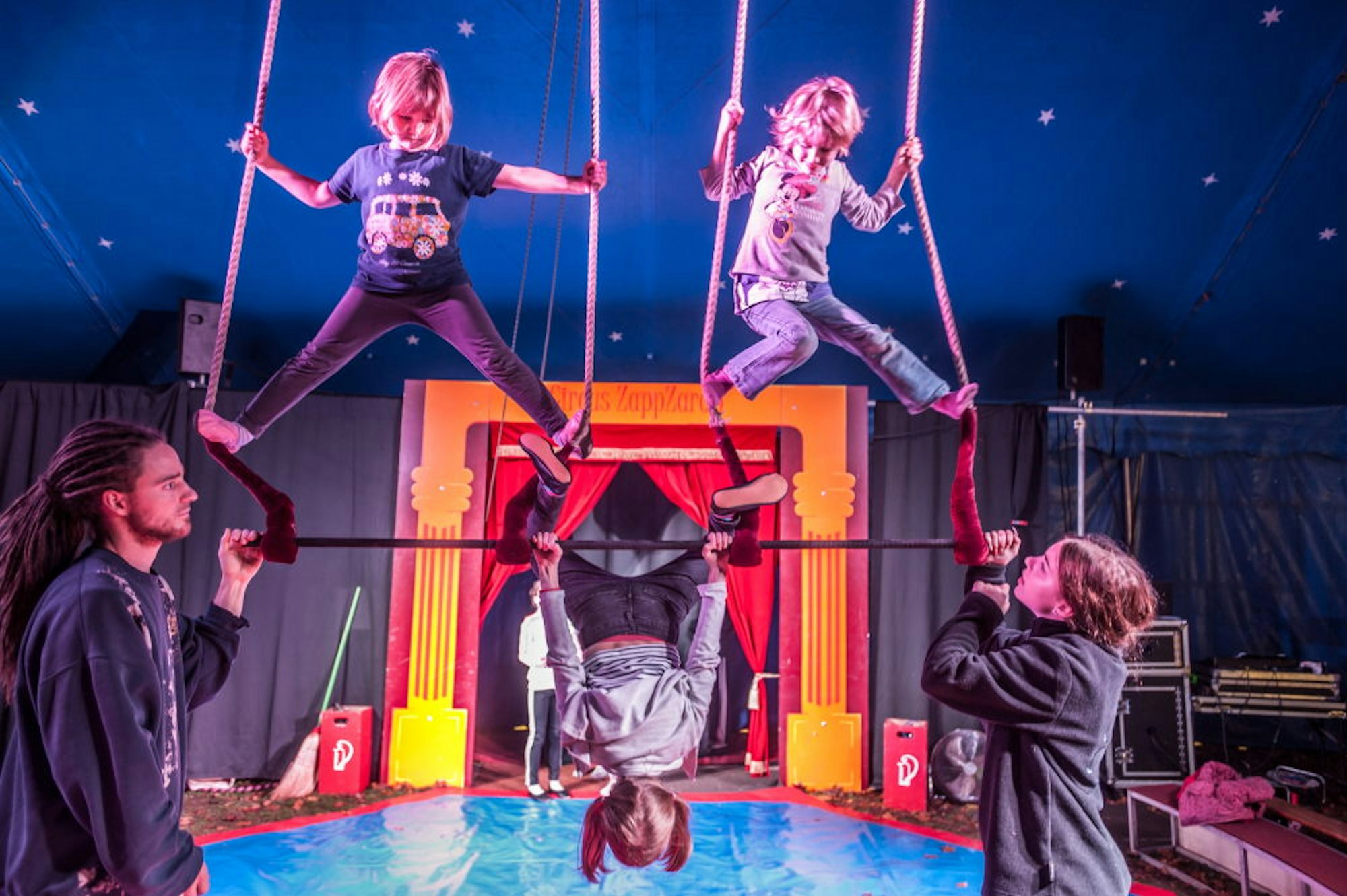 Egal ob bei der Leiterakrobatik oder der Feuershow – Konzentration ist das Wichtigste beim Üben der Tricks. Das wissen auch Lilou und Elaine, die zu zweit eine Figur am Trapez üben. Während Elaine auf dem Trapez steht und sich an den Seilen festhält, hängt Lilou kopfüber an der Stange. Stolz verbeugen sich beide leicht nachdem sie sich vom Trapez herunter geschwungen haben.