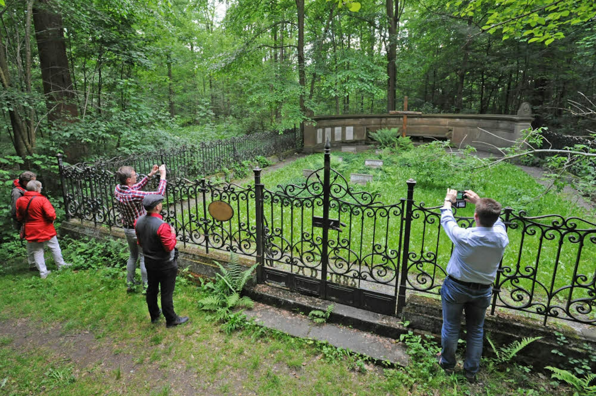 Die Exkursion verlässt den Schlosshof über die Brücke, überquert die Gustav-Heinemann-Straße und stapft auf der anderen Seite in den Wald. Im Gänsemarsch geht es über einen Pfad zur privaten Grabstätte der von Diergardts, die diese auf eigenem Territorium angelegt hatten. Heute ist sie von hohem Gras überwachsen, ein Baum ist darauf gestürzt.