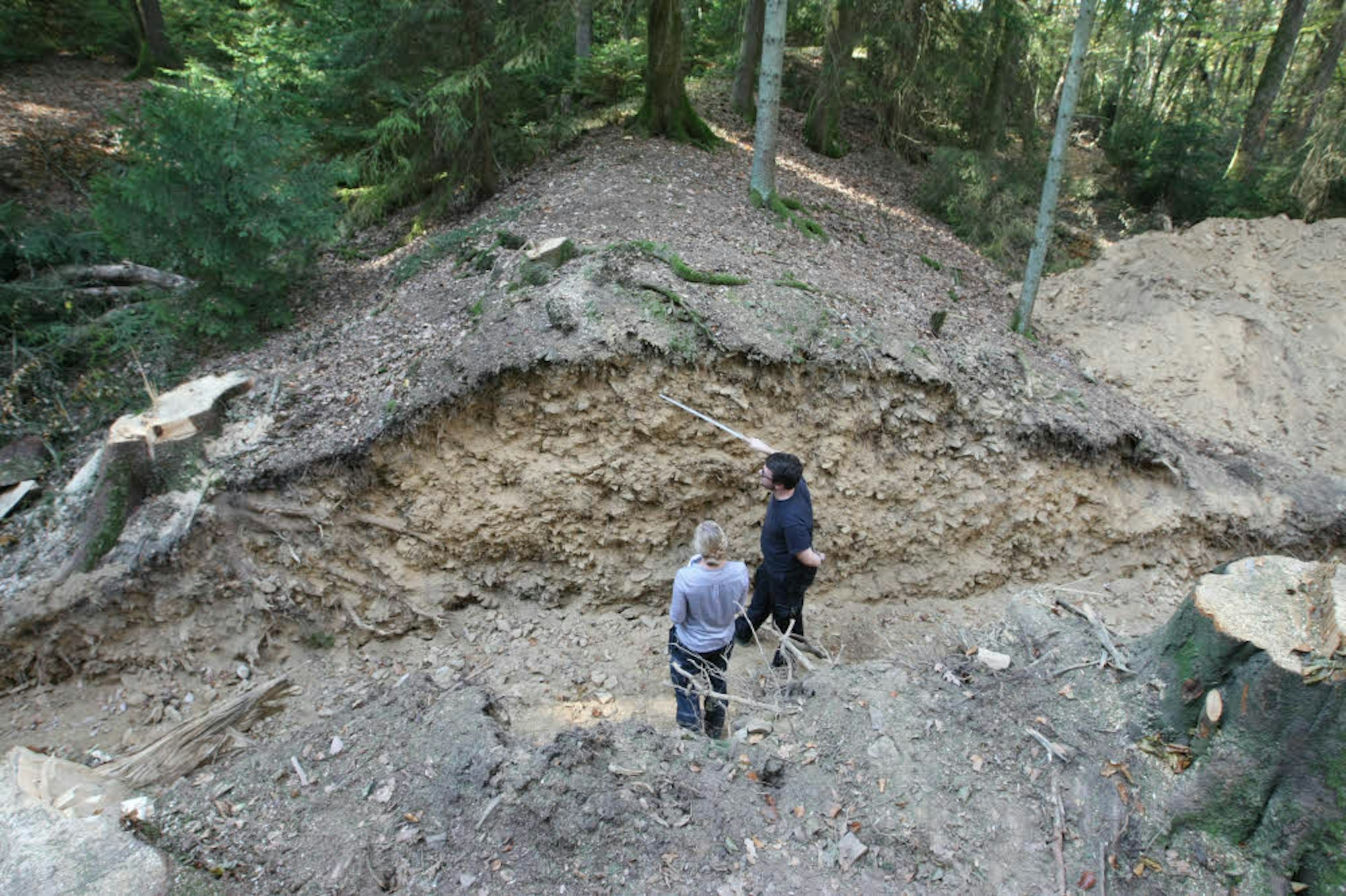Interessanter wurde es für die Forscher am sogenannten Vorwall. Verschiedenfarbige Erdschichten lassen deutlich erkennen, wie er entstand: Aus einem Graben wurde das Erdmaterial entnommen und zum Wall aufgeschüttet. Zudem fanden die Forscher in der Erde klitzekleine Holzkohlepartikel, die bald im Labor untersucht werden. Balkowski: „Wir erhoffen uns, dass mittels der Radiokarbondatierung das Alter der Partikel bestimmt werden kann.“ Dabei wird der Zerfall von Isotopen bestimmt. Somit könnten die Forscher im besten Fall recht genau eingrenzen, wann der Wall entstand. Ins Labor eingeschickt werden auch Bodenproben.