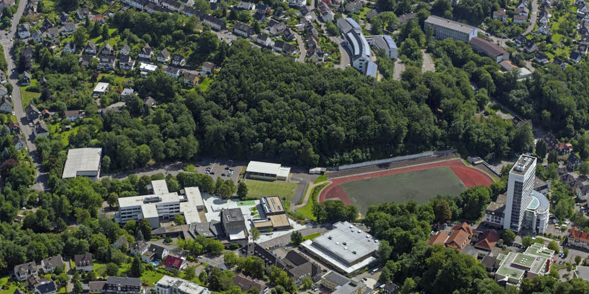 Von der mehrgeschossigen Parkpalette links neben dem kleinen Sportplatz könnte eine Fußgängerbrücke Richtung Berufskolleg (oben M.) führen.