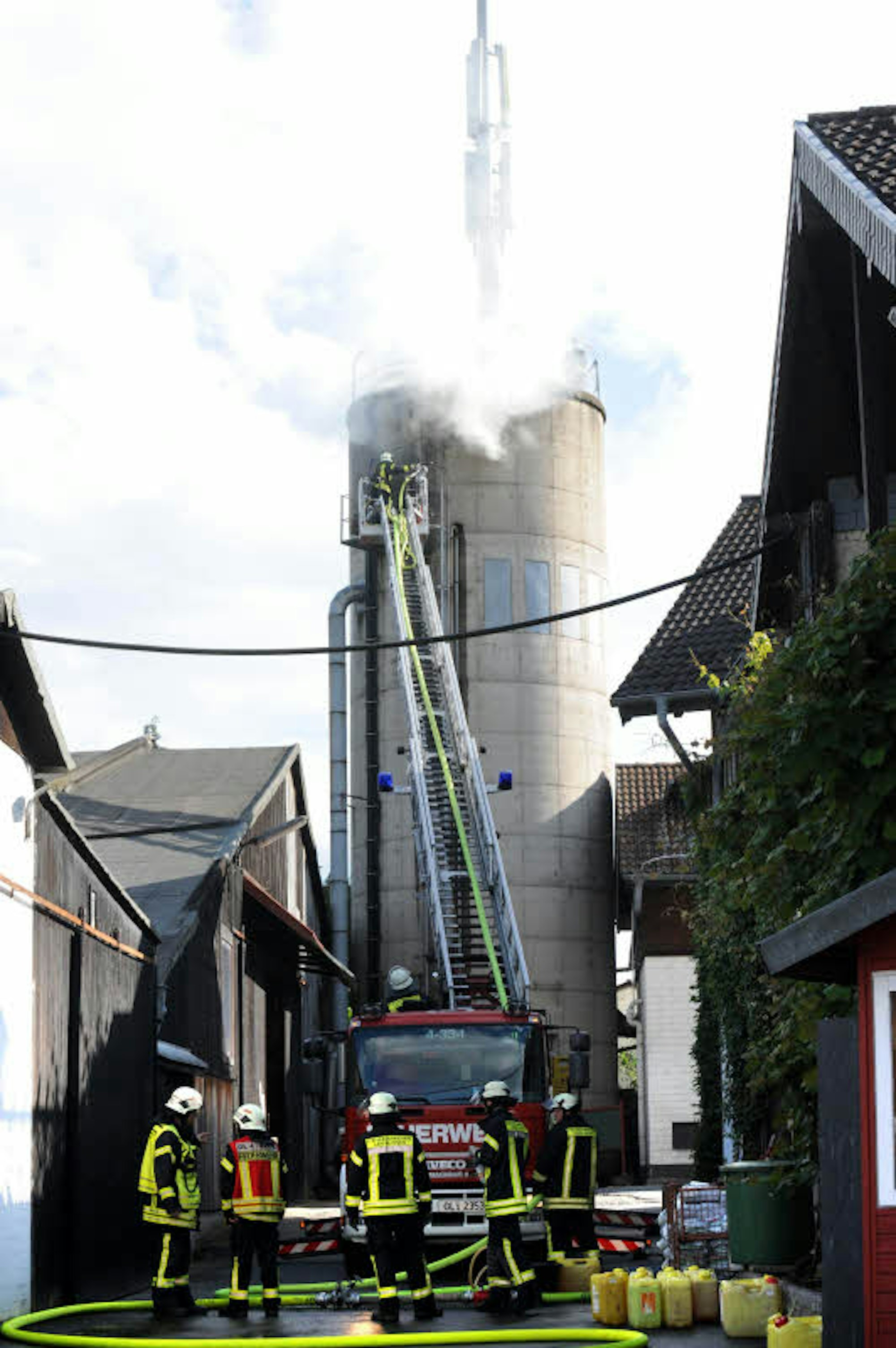 Dichter Rauch quoll aus dem Bunkerturm auf dem Firmengelände, in dem die Holzspäne in Brand geraten waren.