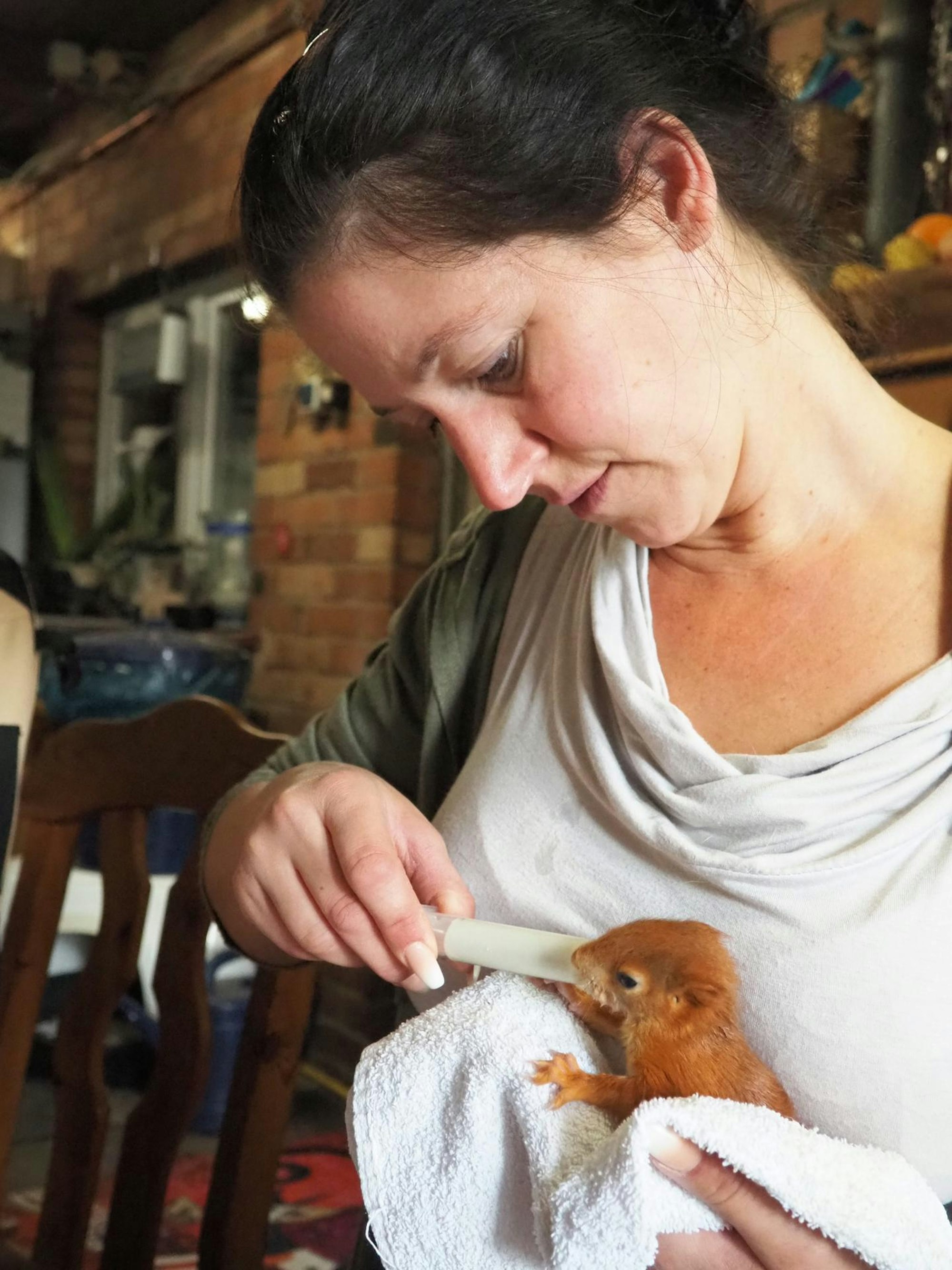Mit Katzenaufzuchtmilch aus der Spritze werden die ganz jungen Fundtiere gefüttert. Dann geht das Training Schritt für Schritt weiter, bis die Tiere Nüsse knacken können.