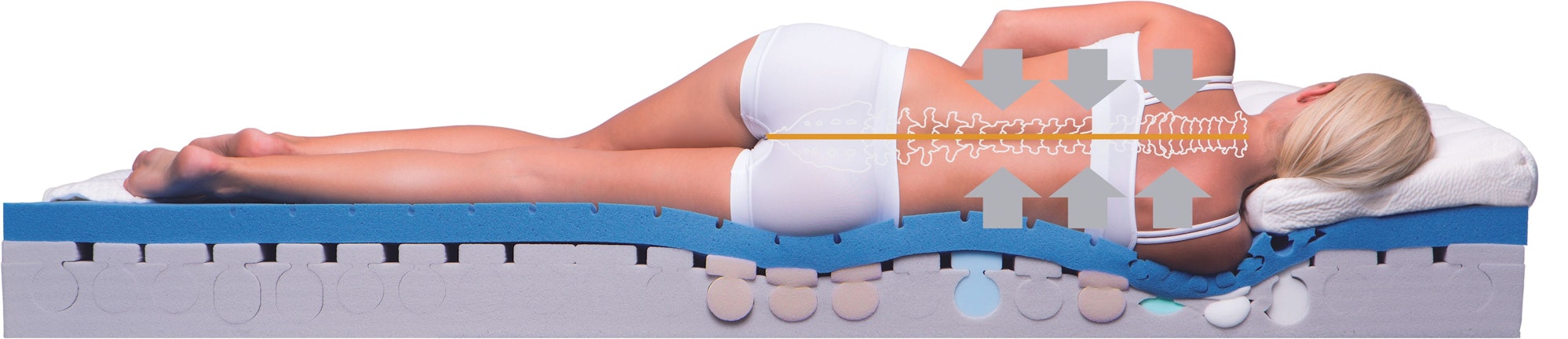 Um Verspannungen und Schmerzen sowie die damit verbundenen nächtlichen Schlafstörungen zu beseitigen, sollte die Wirbelsäule in der „neutralen Position“ gelagert werden. „Neutral“ bedeutet in diesem Fall, dass die natürliche Krümmung der Wirbelsäule erhalten bleibt und ihre Segmente allesamt in einer möglichst geraden Linie ausgerichtet sind. Denn: In dieser Position ist die Belastung auf die Wirbelkörper, Bandscheiben, Muskeln und Bänder am geringsten. Verspannungen und Schmerzen können somit bestmöglich vermieden werden, der Körper kommt zur Ruhe.