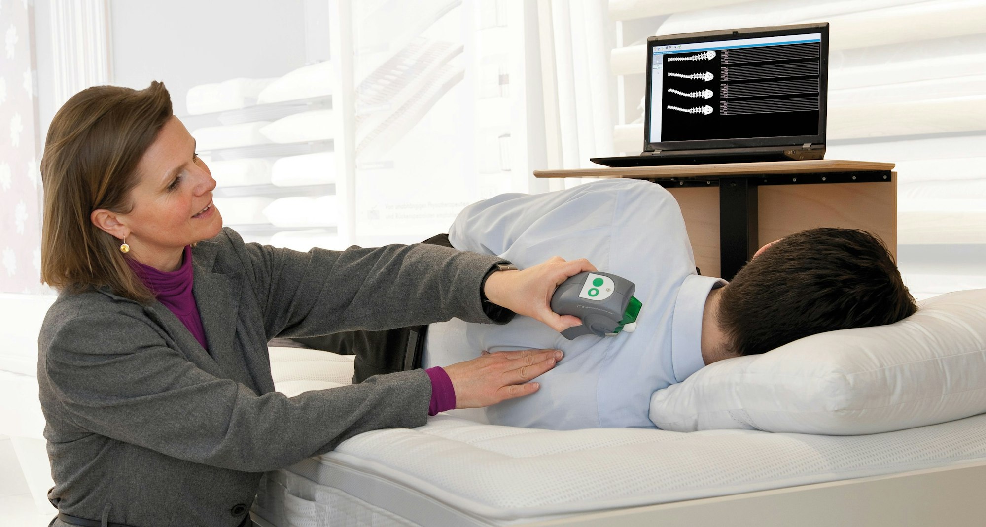 Um das zu erreichen, muss die seitlich verkrümmte Form zunächst sichtbar gemacht werden, da diese keineswegs immer gleich ist. In dem Schlaffachgeschäft Traumkonzept in Köln und in Bonn wird das von ausgebildeten Fachleuten mit einem Scanningverfahren ermöglicht. Der Wirbelscanner, ein handliches kleines Gerät, verwendet ein optisches Messsystem, um die Position und Krümmung der Wirbelsäule zu erfassen. Er bleibt dabei strahlungsfrei, bei medizinisch verlässlichen Bildern. Während der Anwendung wird die Wirbelsäule zunächst im Stehen aufgenommen, um zu beurteilen, wie und wo sie gekrümmt ist. Das entstandene Referenzbild hilft schließlich dabei, die in Frage kommenden Matratzen, Lattenroste und Kissen richtig auszuwählen.