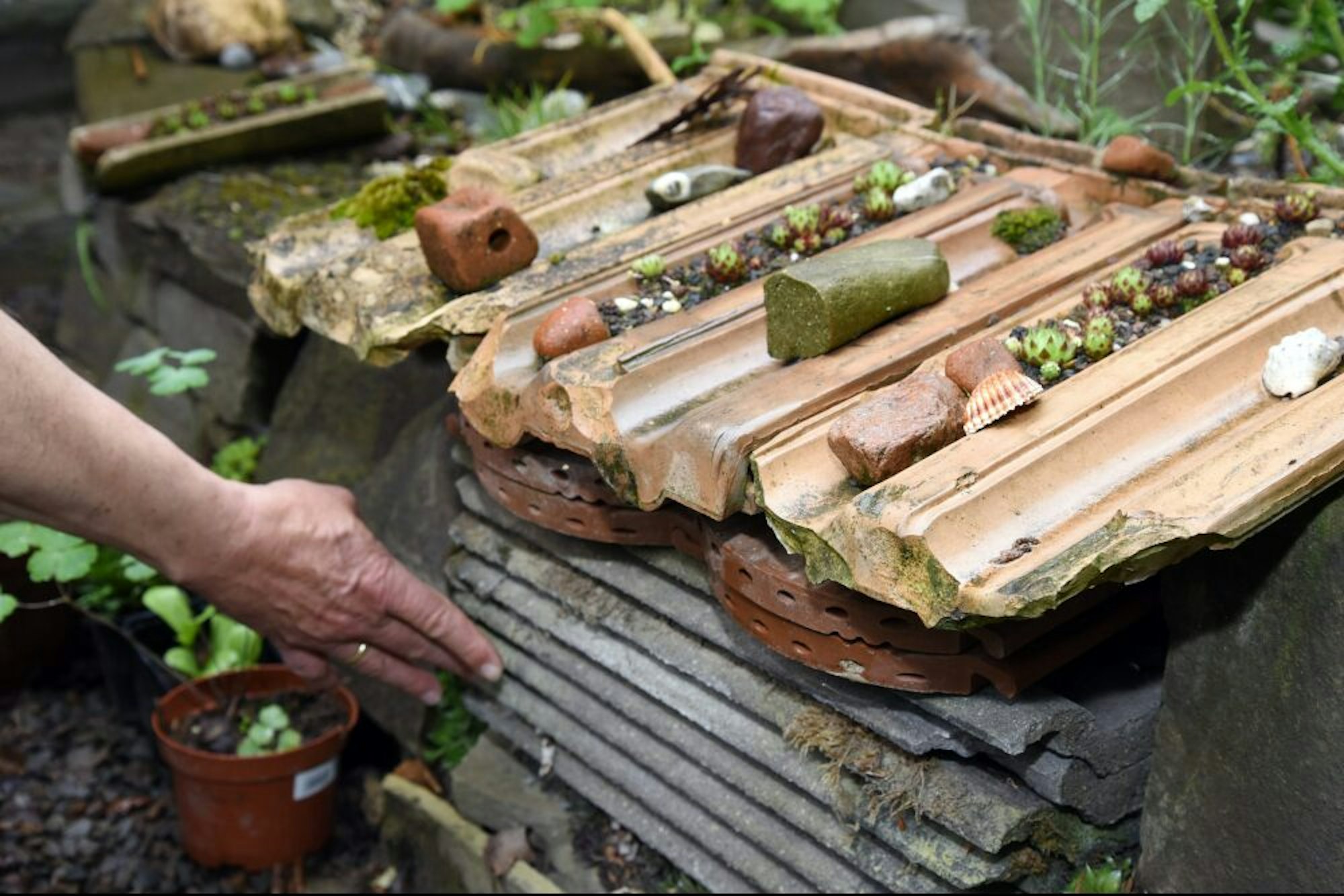 Zum Einsatz kommen bei der Gestaltung vor allem recycelte Materialien, wie das Insektenhotel mit alten Dachpfannen.
