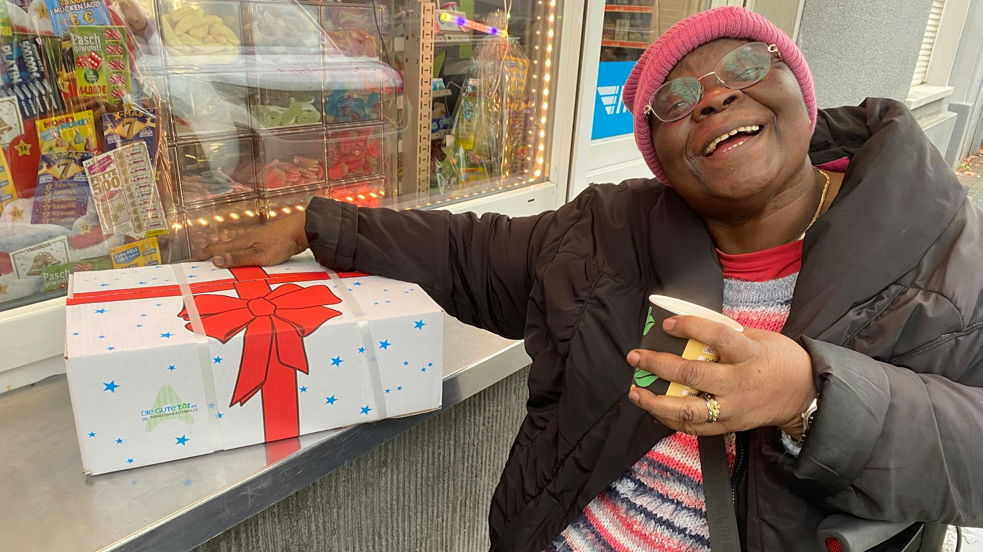 Es ist schon das dritte Paket, das Erika Fehring und Dietmar Saxler heute in Köln-Mülheim überbringen. Die Seniorenberater des Vereins Zu Huss e.V., der auch Pflege und hauswirtschaftliche Hilfe anbietet, sind dabei mit Fahrrädern unterwegs, die DIE GUTE TAT e.V. gespendet hat - so wie alle Mitarbeitenden von Zu Huss. Erst waren sie bei einer 66-Jährigen, der vor Rührung die Tränen kamen: „Ich bekomme doch sonst überhaupt kein Geschenk.“ In die Zeitung möchte sie aber nicht. Dann ging es weiter zu Essoham Benedicta Wittkamp-Palanga. Die 70-jährige Witwe, die in Togo geboren wurde, nimmt das Weihnachtspaket an einem Kiosk entgegen. Sie lässt sich gerne damit fotografieren und sagt: „Ich möchte mich wirklich bedanken für das Paket. Ich bin total froh.“