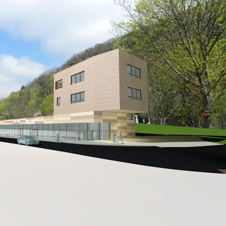 Dahinter, zur Landesstraße 194 hin und mit gebührendem Abstand zu ebendieser, wird ein Seminarhaus errichtet, das in seiner Architektur an eine Light-Version der Kölner Kranhäuser erinnert.