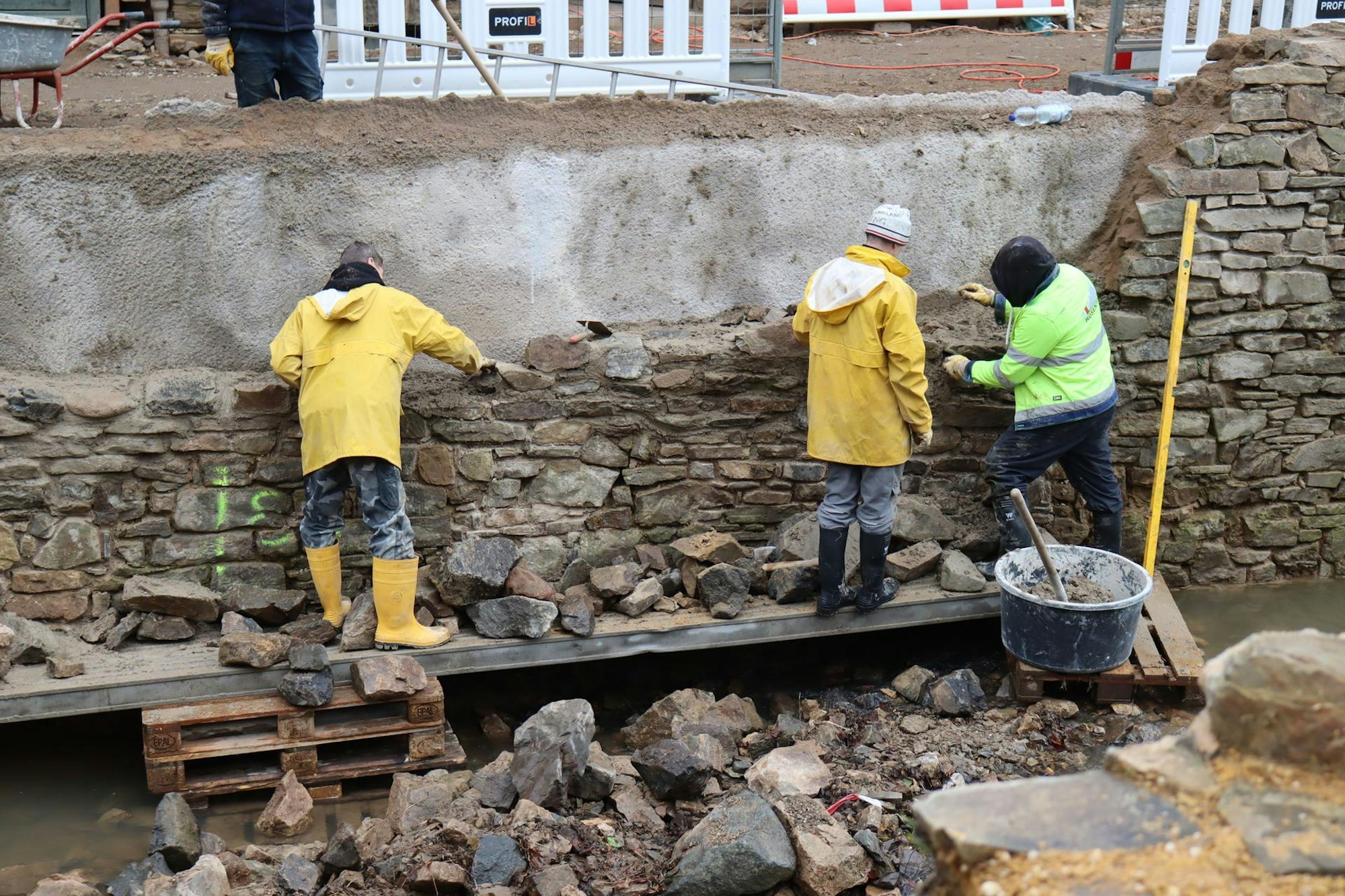 Bad Münstereifel – Fast die Hälfte der Arbeit ist geschafft. Dennoch fallen beim Wiederaufbau der Erftmauern in der Münstereifeler Innenstadt vor allen Dingen die Stellen auf, die noch fehlen. Am Salzmarkt und auf der gegenüberliegenden Seite, also an der Fibergasse, zum Beispiel. Denn dort traf das Wasser, das über die Orchheimer Straße schoss, auf das Wasser aus der Erft. Die Wucht war so enorm, dass die Erftmauer an einigen Stellen komplett fehlt – auch das Heiligenhäuschen wurde ein Raub des Wassers.