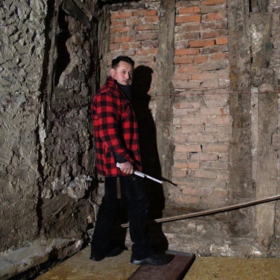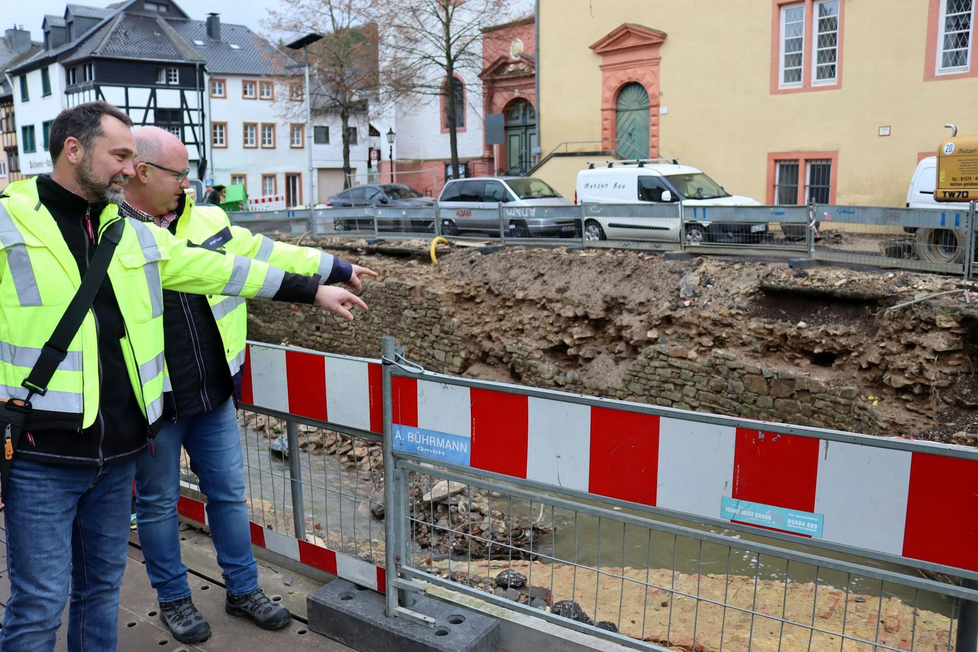 Am Salzmarkt klafft ein großes Loch in der Erftmauer. Dort wird eine Betonwand zur Stabilisierung gegossen.