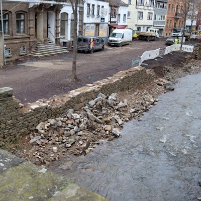 Die Erft ist nach dem Dauerregen von Sonntag der Straßenoberkante bedrohlich nahegekommen. Der aktuelle Wasserstand erschwert auch die Wiederherstellung der Erftmauer. „Wir benötigen einen Gerüstbau im Wasser“, erklärt Norbert Schäfer, Ingenieur des Büros Lorenz. Die passende Temperatur muss auch vorhanden sein. Fünf Grad sollten nicht unterschritten werden.