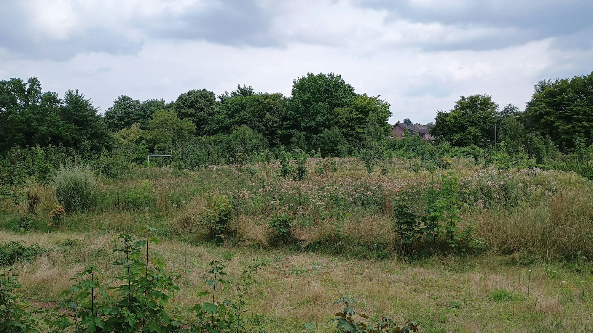 Der Platz ist so hoch bewachsen, dass nur noch die Tore daran erinnern, dass hier einmal Fußball gespielt wurde.
