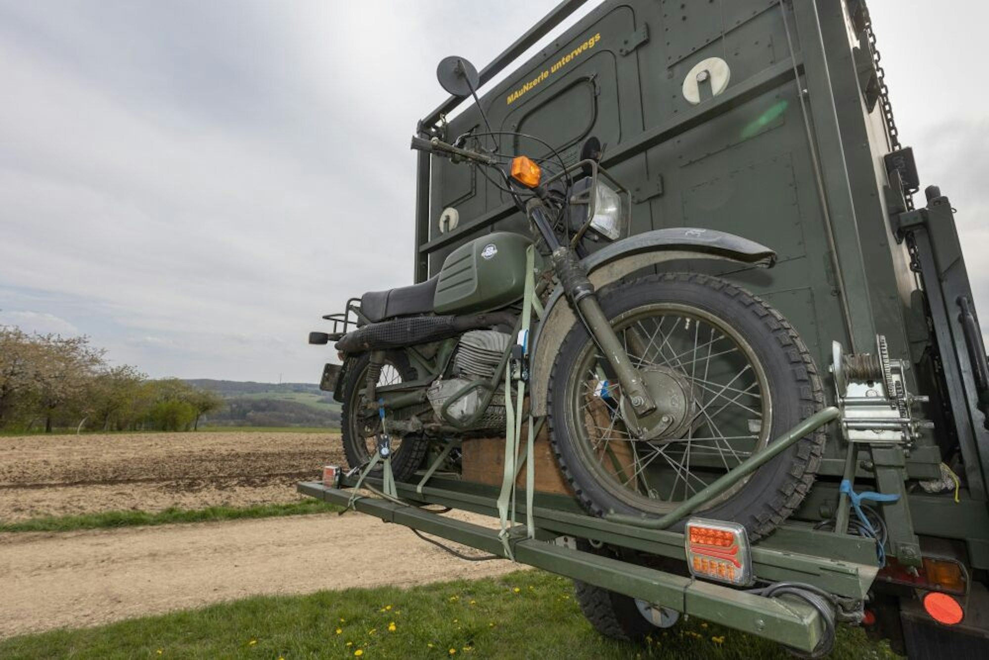„Um den Container anzuschaffen, haben wir unseren Wohnwagen verkauft“, verrät Anke Braunöhler, während ihr Mann berichtet, dass die Inneneinrichtung des Wohnraumes in luftiger Höhe komplett aus Massivholz besteht. „Das Holz stammt aus unserem eigenen Wald. Wir haben die Einrichtung vorher in Ruhe geplant und dann, perfekt an unsere Bedürfnisse angepasst, eingebaut“, erklärt Eric Prang. Am Heck ist sogar ein Motorrad befestigt, falls kurze Strecken zu bewältigen sind oder Hilfe geholt werden muss.