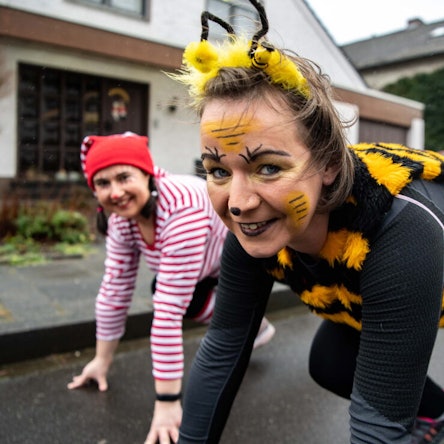 Freude und Wehmut, die gehen an diesem Abend ohnehin Hand in Hand den Alten Weg hoch. Der bildet – normalerweise – die erste Hälfte des Zugwegs. Kurz vor der Kirchenkurve bildet sich – normalerweise – ein Stau, da alle die schönste Lichterzug-Passage in vollen Zügen genießen wollen. „Hier nehmen wir sonst richtig Schwung“, stellen Heike Wahlen und Anneliese Urfell fest. Letztere hat für den Spaziergang einen Kostümmix gewählt. Die Eulen-Jacke vom vergangenen Jahr, der Rosen-Hut vom Jahr davor. Da sie mit Kostümen ihren Wintergarten dekoriert, sind die auch schnell parat für ein bisschen Fastelovends-Jeföhl.