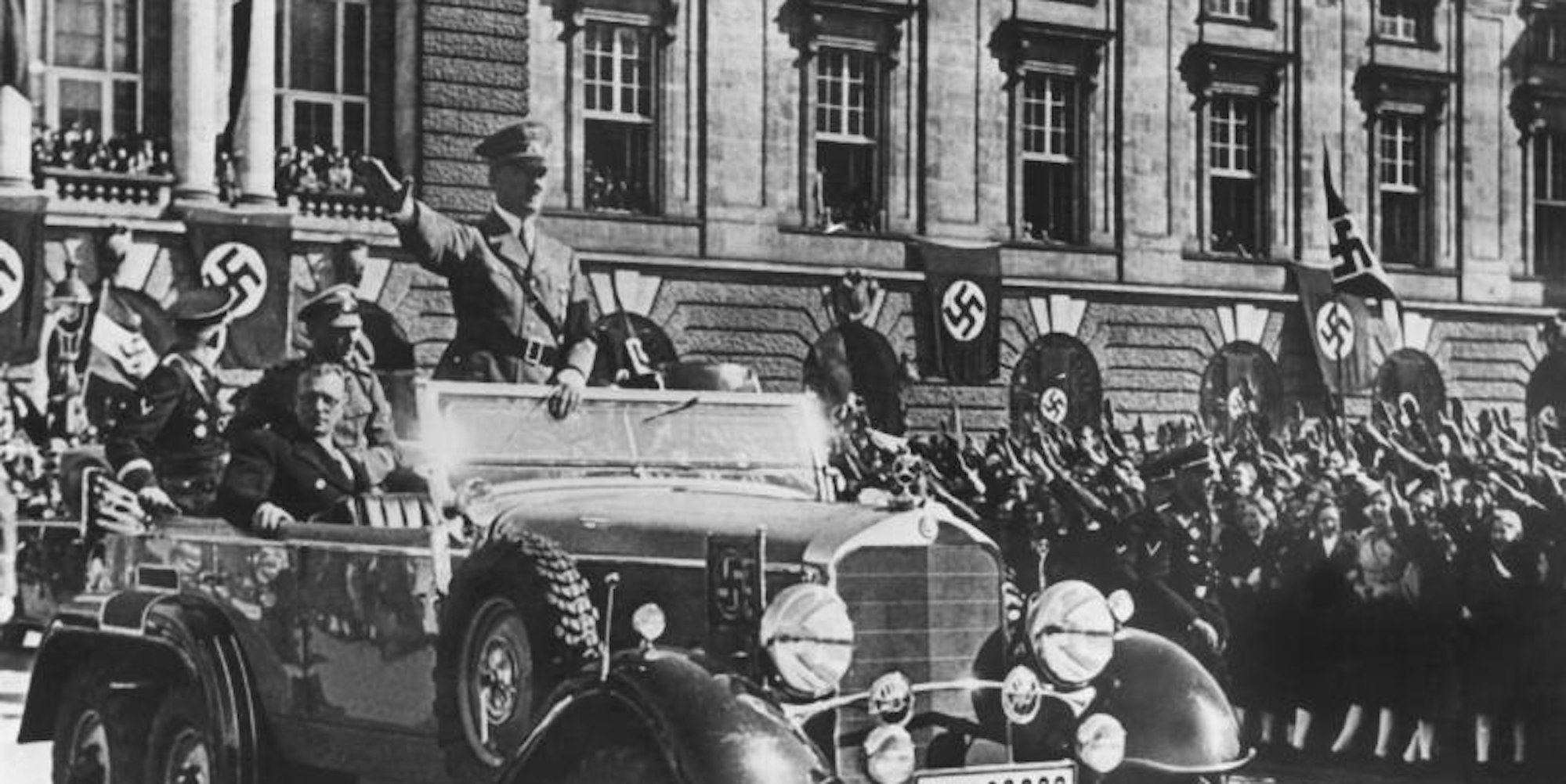 Adolf Hitler grüßt die ihm zujubelnde Menschenmenge in Wien, neben ihm sitzt der österreichische Kanzler Arthur Seyss-Inquart.