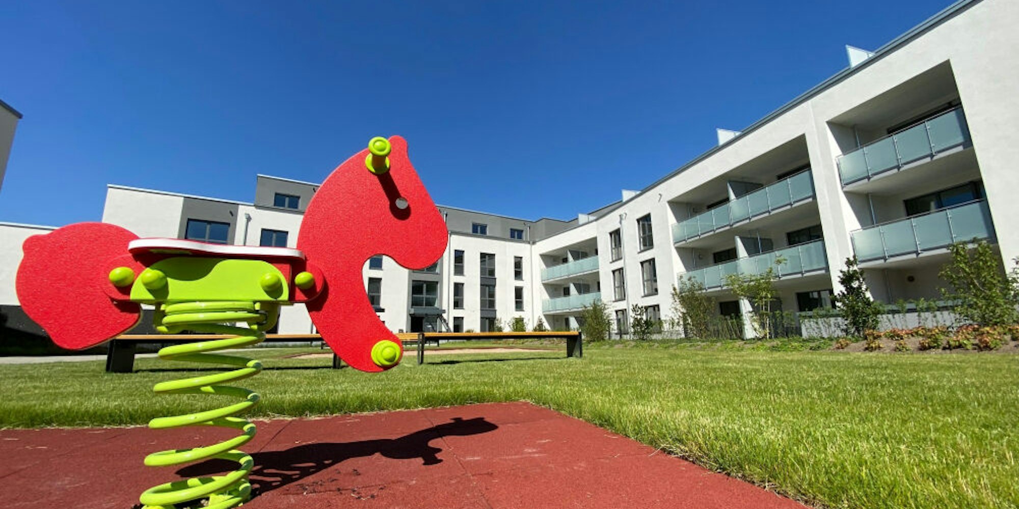 Brühl-Ost – Der Rollrasen ist verlegt, der Sandkasten frisch geharkt – und, noch wichtiger: Die Häuser sind nach rund zwei Jahren Bauzeit bezugsfertig. Was in dem Gebäudekomplex im Dreieck von Berger- und Weißer-Straße noch fehlt, sind die Mieter, die in den 99 Wohnungen für Leben sorgen. Das wird sich jedoch in Kürze ändern, verspricht Gregor Boldt, Sprecher der Gelsenkirchener Vivawest Wohnen GmbH, die die Bauten von der Grenzland-Bau GmbH hat errichten lassen. Rund 600 Interessenten hätten sich gemeldet, längst seien alle Wohnungen vermietet und Ende Juni beginne auch schon der Einzug.