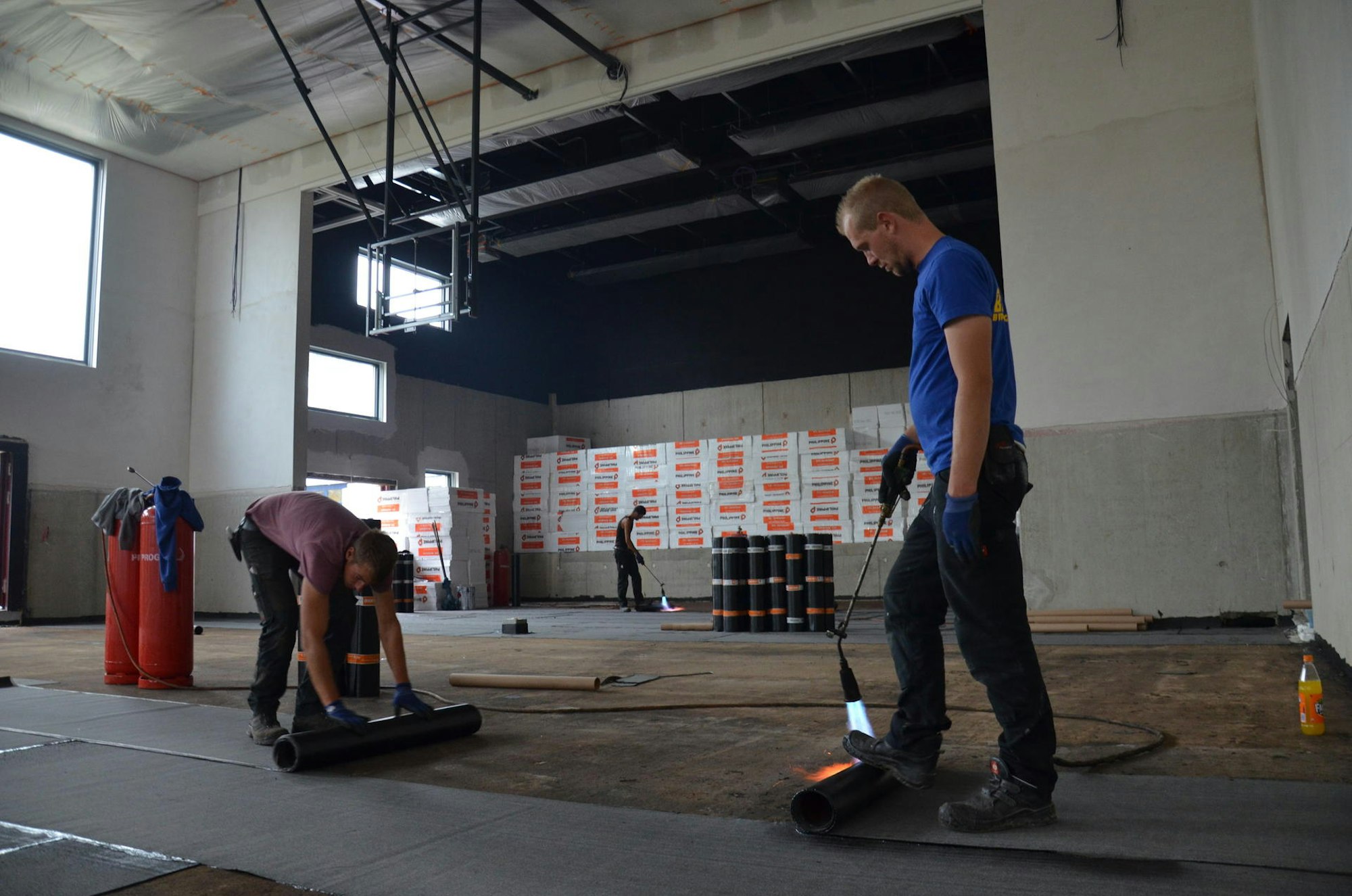 Derzeit wird am Bodenbelag der Sporthalle gearbeitet. In der Aussparung am Kopf der Halle findet künftig die Bühne Platz.