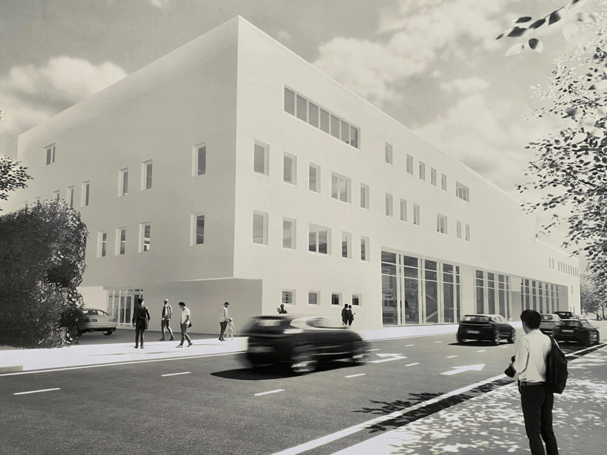 Die Visualisierung des Neubaus zeigt die Ansicht von Südosten.