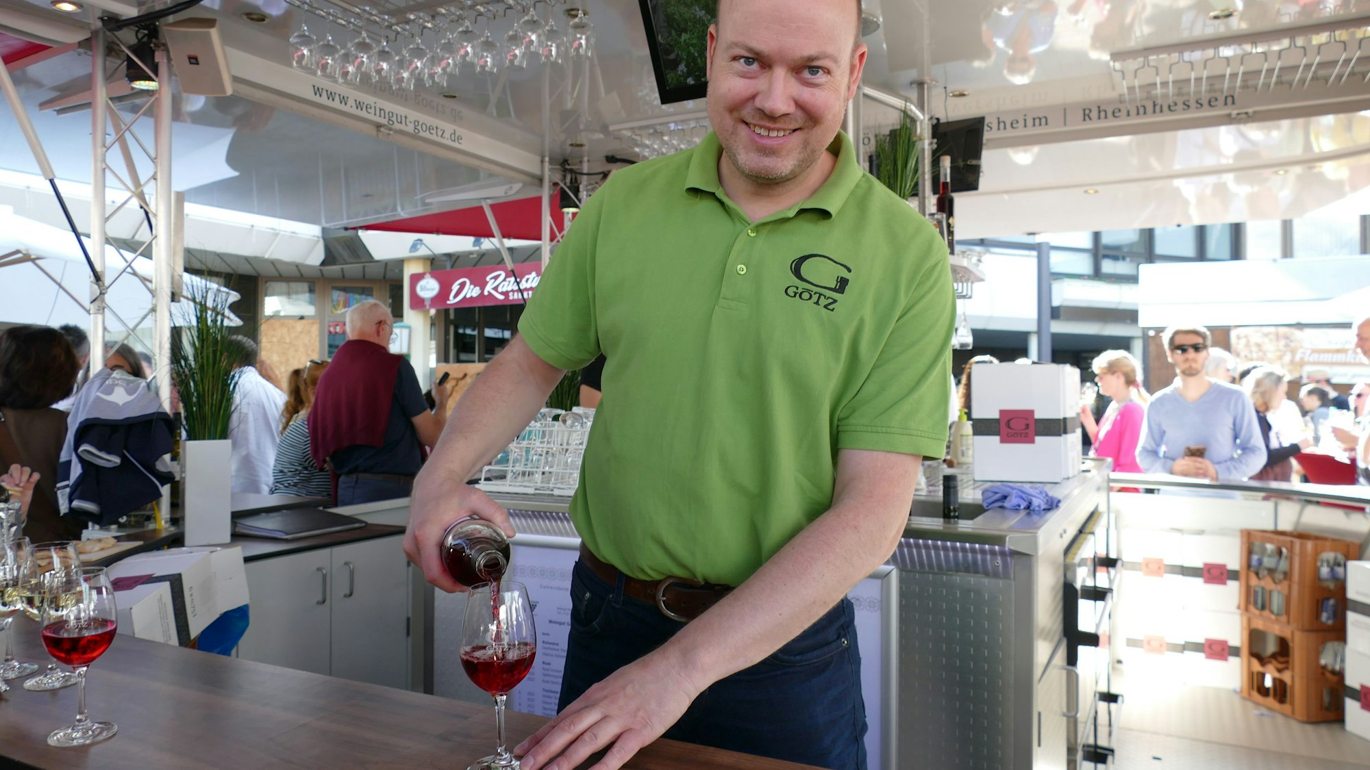 Das Weinfest in Sankt Augustin sei das erste in dieser Saison für ihn und sein Team. Die Gegend ist ihm bestens bekannt, auch auf den Weinfesten in Hennef und Siegburg ist Weinbau Götz regelmäßig zu Gast und hat sich nicht nur einen guten Ruf, sondern auch eine Stammkundschaft aufgebaut.