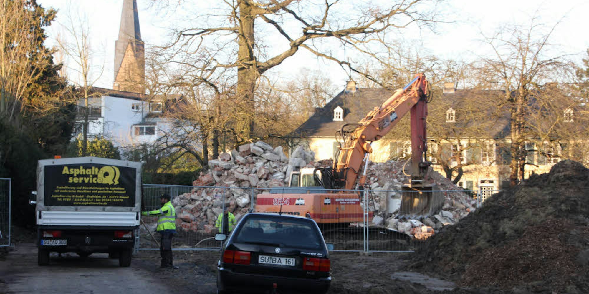 Mit einem Bagger werden derzeit die Überreste der früheren Ungers-Villa an der Beethovenstraße beseitigt, um das Areal mit barrierefreien Wohnungen bebauen zu können.