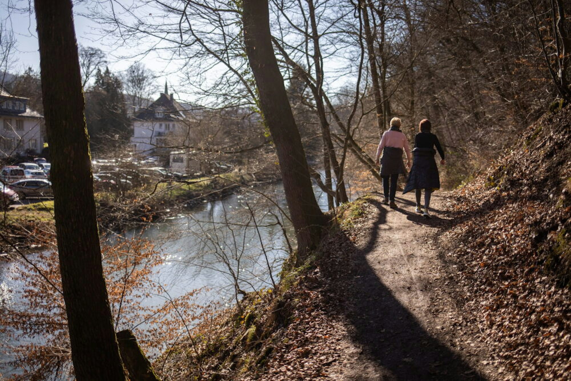 Dann geht es immer der weißen 14 auf rotem Grund hinterher, durch den Kurpark und über die Agger. Dort halten wir uns rechts und laufen immer am Flussufer entlang. Tafel B beschreibt, dass sich die Erdoberfläche einst in Falten legte wie eine ... (2. Wort)