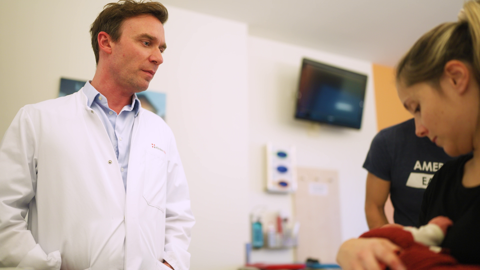 Enger Austausch zwischen Ärzt*innen-Team und Patientinnen: Dr. Mallmann im Gespräch mit einer frisch gebackenen Mutter.