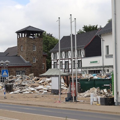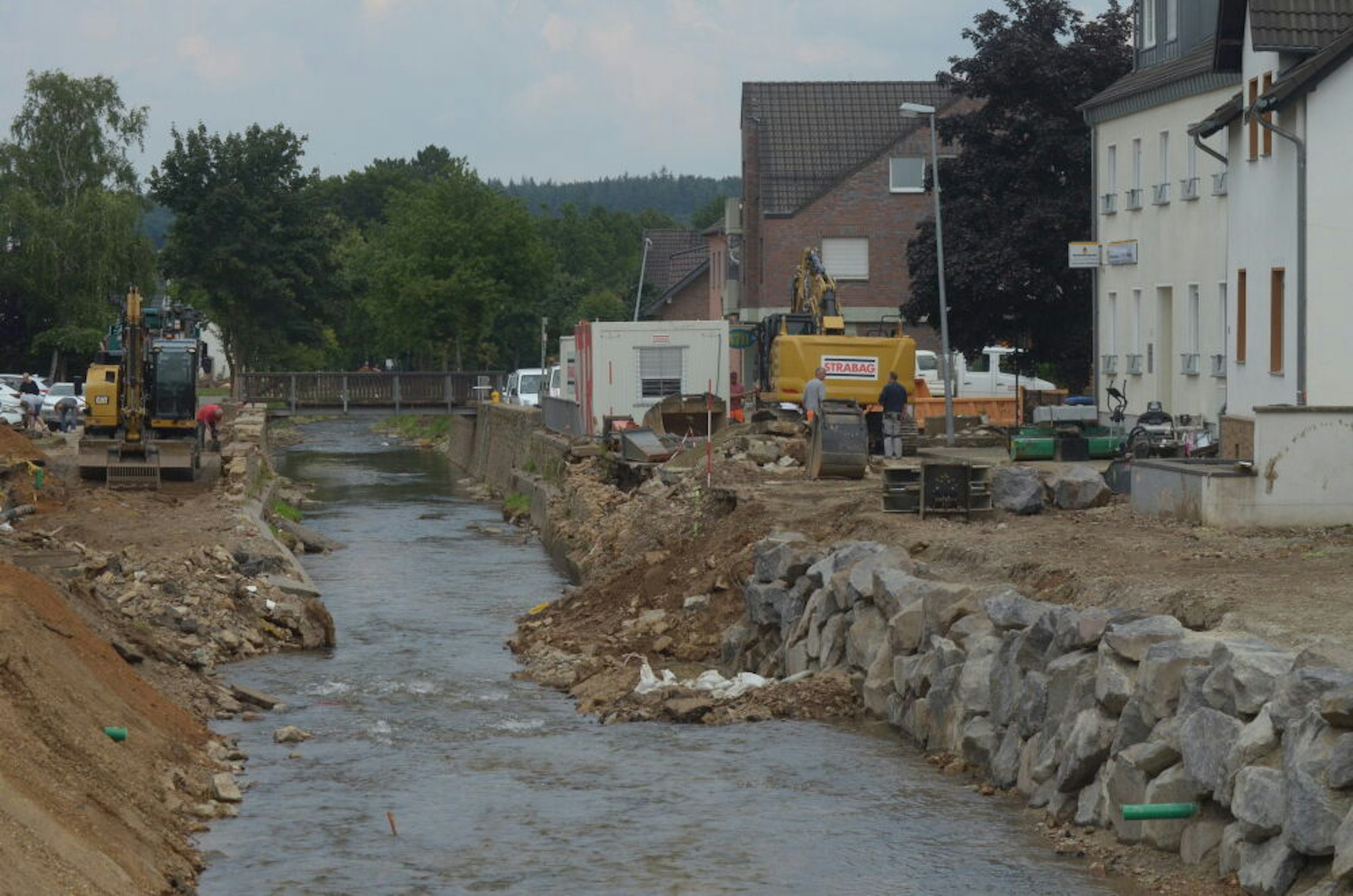 Während im Verteilzentrum schon kurz nach der Öffnung beachtlicher Betrieb herrscht, sind im Ortskern schwere Bagger im Einsatz. Die Flutwelle hat weite Teile der Bachstraße und der Straße Erlenhecke zerstört, die die Erft säumen – und natürlich auch die Mauern, die den Fluss einfassten. Mittlerweile haben Mitarbeiter der Firma Strabag mit den Baggern mächtige Steine zu einer provisorischen Böschung übereinandergelegt.