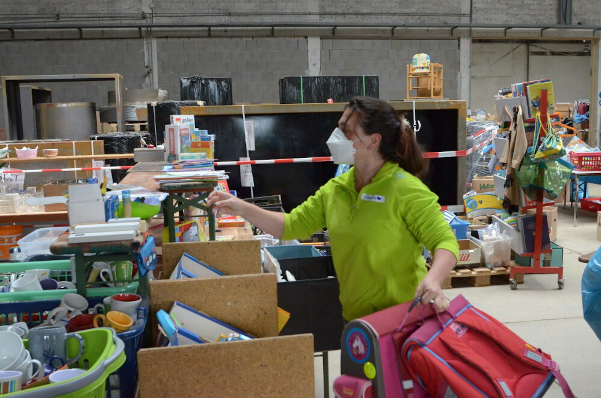 Im Verteilzentrum in den früheren Thonwerken sorgen Ehrenamtler wie Chavva Schneider für die Versorgung der Hilfsbedürftigen.