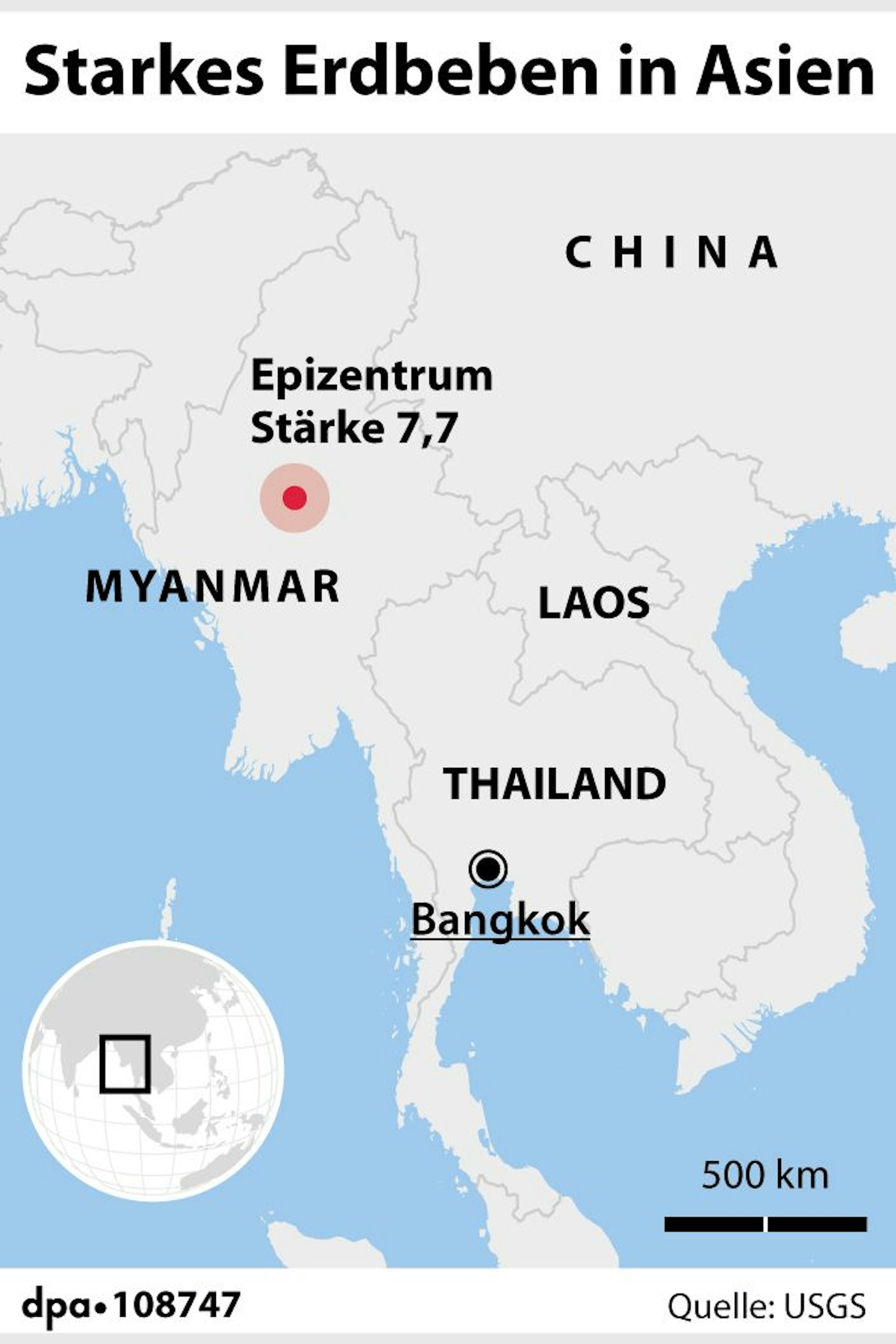 In Myanmar und Thailand hat sich am Freitag ein schweres Erdbeben mit Toten, zahlreichen Verletzten und großen Zerstörungen ereignet. Das Deutsche Geoforschungsinstitut (GFZ) in Potsdam meldete ein Erdbeben der Stärke 7,4 im Nachbarland Myanmar, die US-Erdebebenwarte USGS verzeichnete die Stärke 7,7. In Myanmars Hauptstadt Naypyidaw habe es „zahlreiche Opfer“ gegeben, berichtet die Nachrichtenagentur AFP, auch in Mandalay gibt es viele Todesopfer. Nach Angaben der Militärführung von Myanmar sind mindestens 144 Menschen gestorben. Weitere 732 Menschen wurden verletzt, wie die Junta im staatlichen Fernsehen bekanntgab. In Bangkok ist unterdessen ein im Bau befindliches Hochhaus eingestürzt. Unter den Trümmern des unfertigen Wolkenkratzers im Norden der Stadt seien 81 Menschen verschüttet, mindestens drei von ihnen starben.