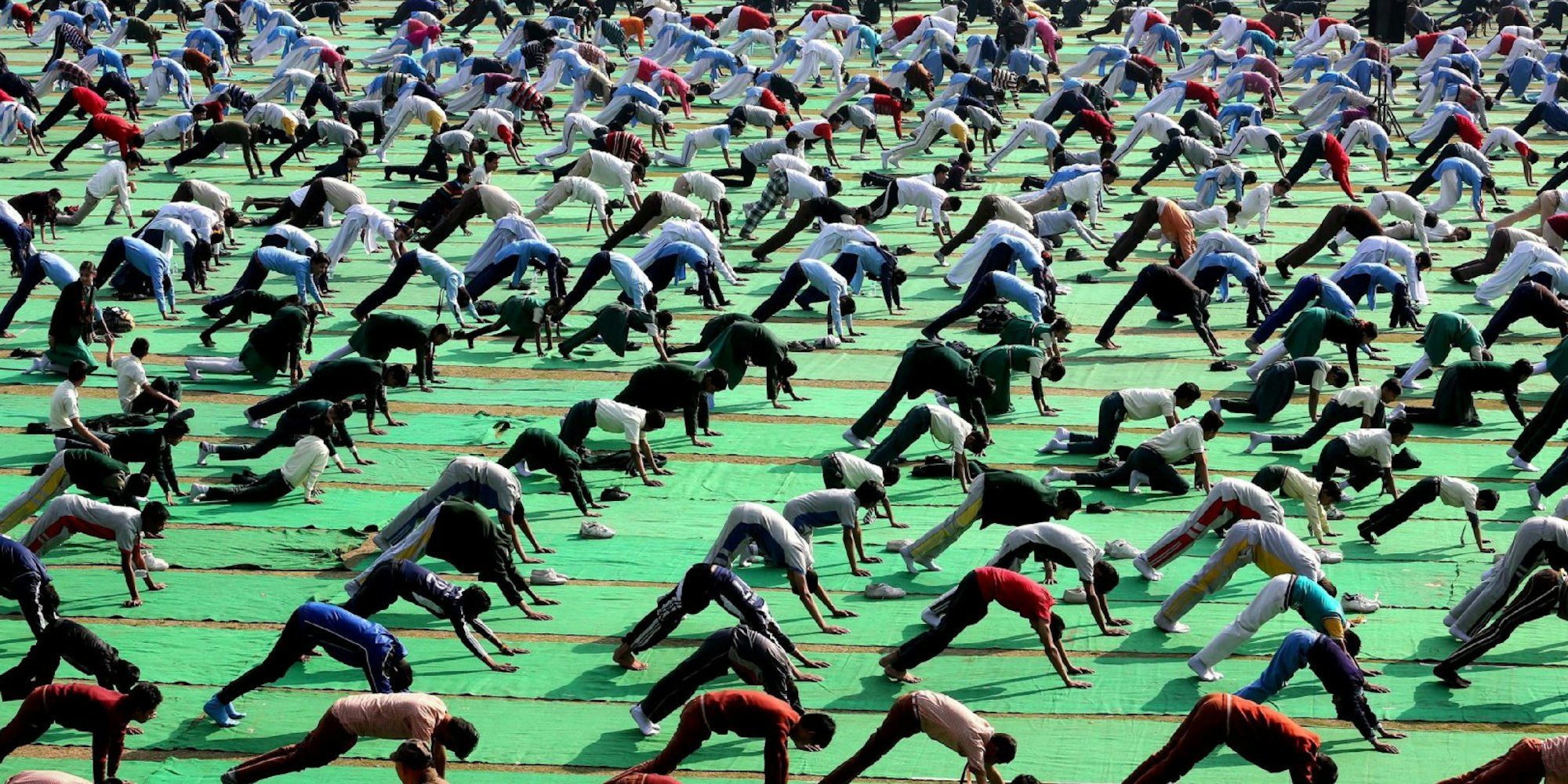Menschen beim Massenyoga in Indien. Auch in Deutschland wird Yoga immer beliebter.