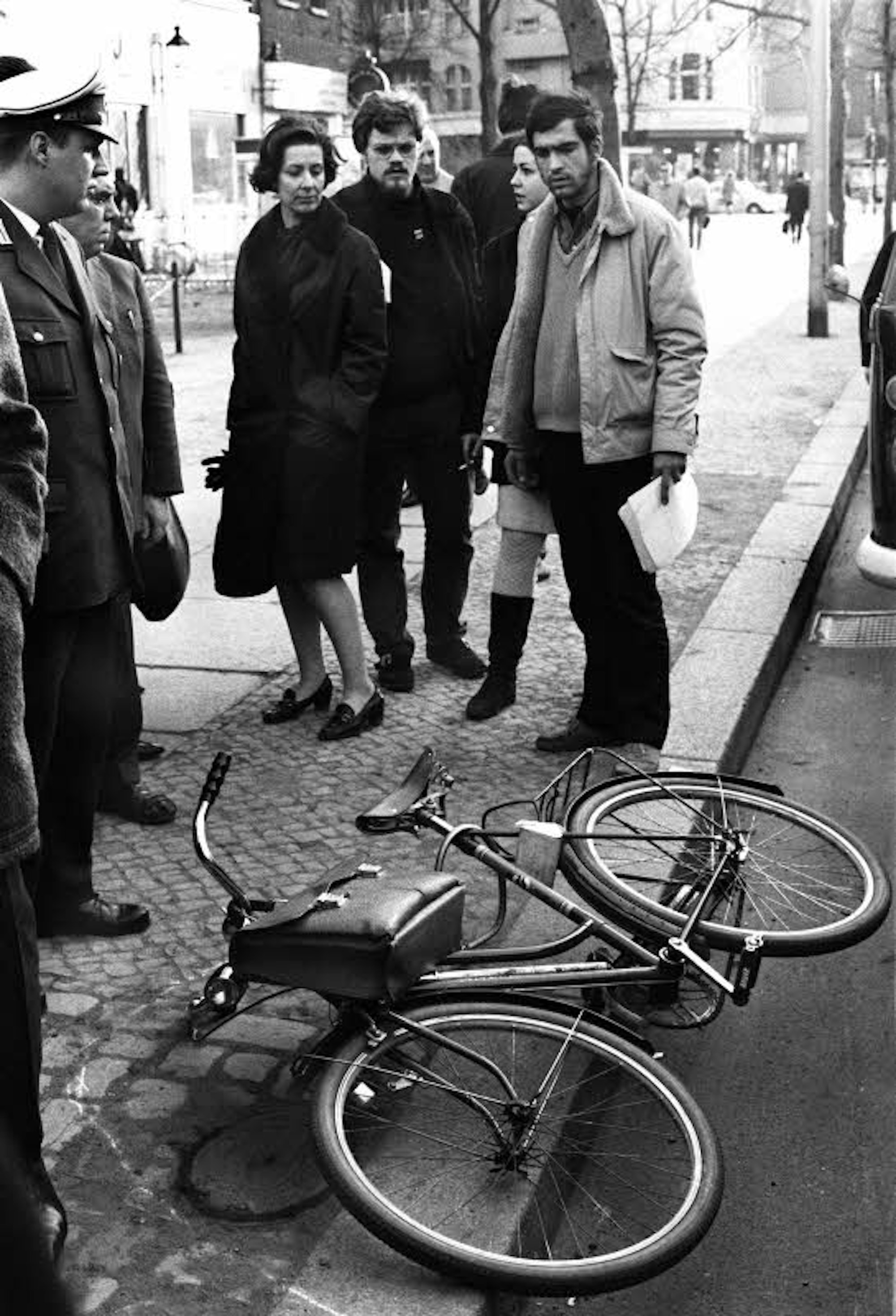 Das Fahrrad von Rudi Dutschke am Tatort am Kurfürstendamm in Berlin, wo er am 11. April 1968 niedergeschossen wurde.