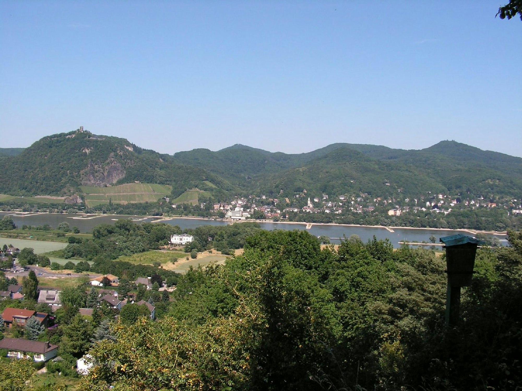 Blick vom Rodderberg über Mehlem und den Rhein hinweg auf Bad Honnef-Rhöndorf und das Siebengebirge mit dem Drachenfels.