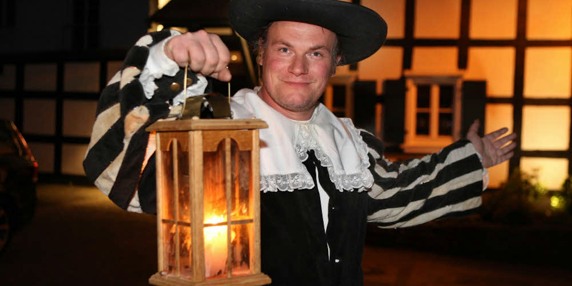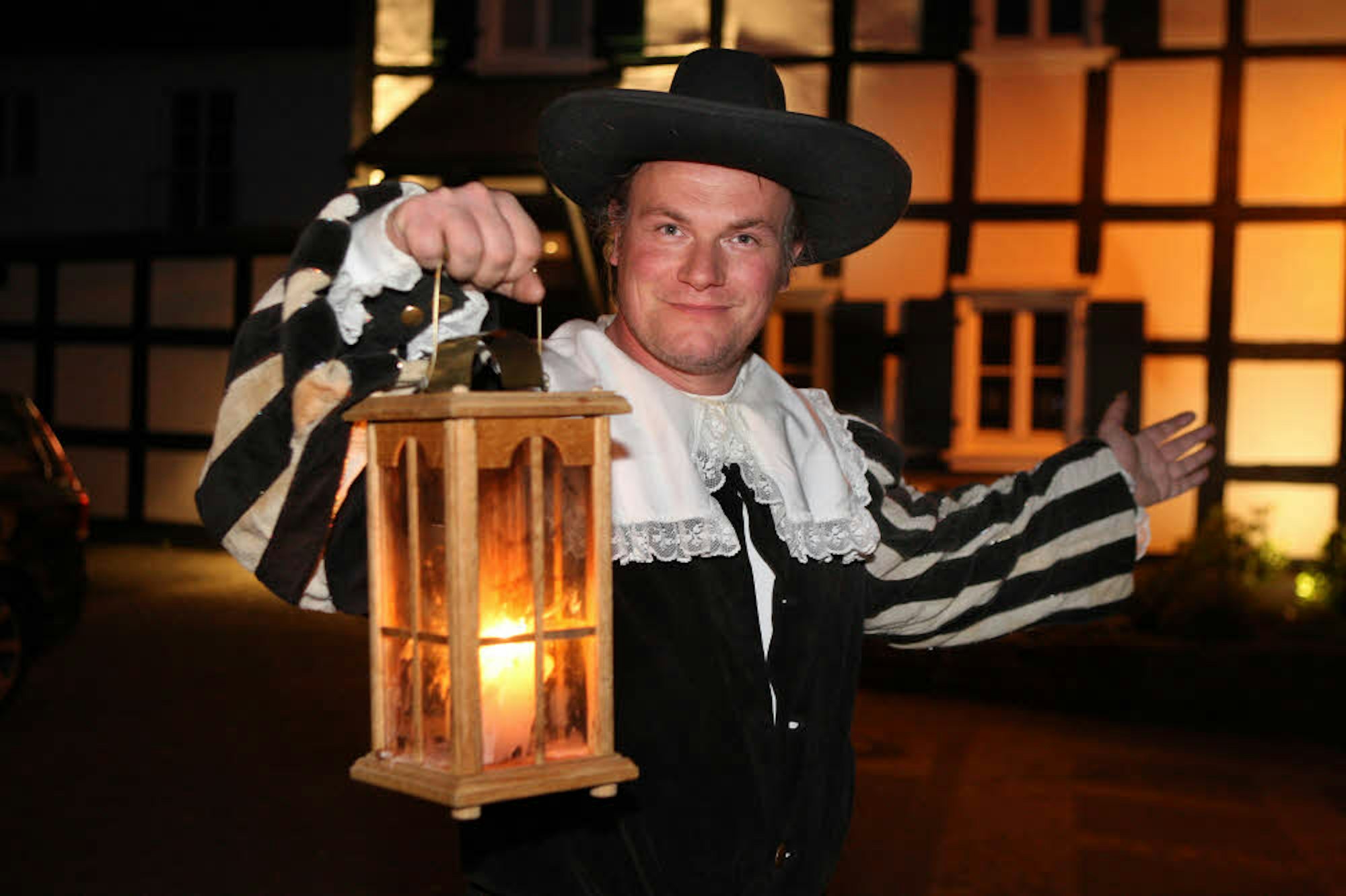 In historischer Montur und mit Laterne führt David Bosbach als Nachtwächter durch den Odenthaler Ortskern.