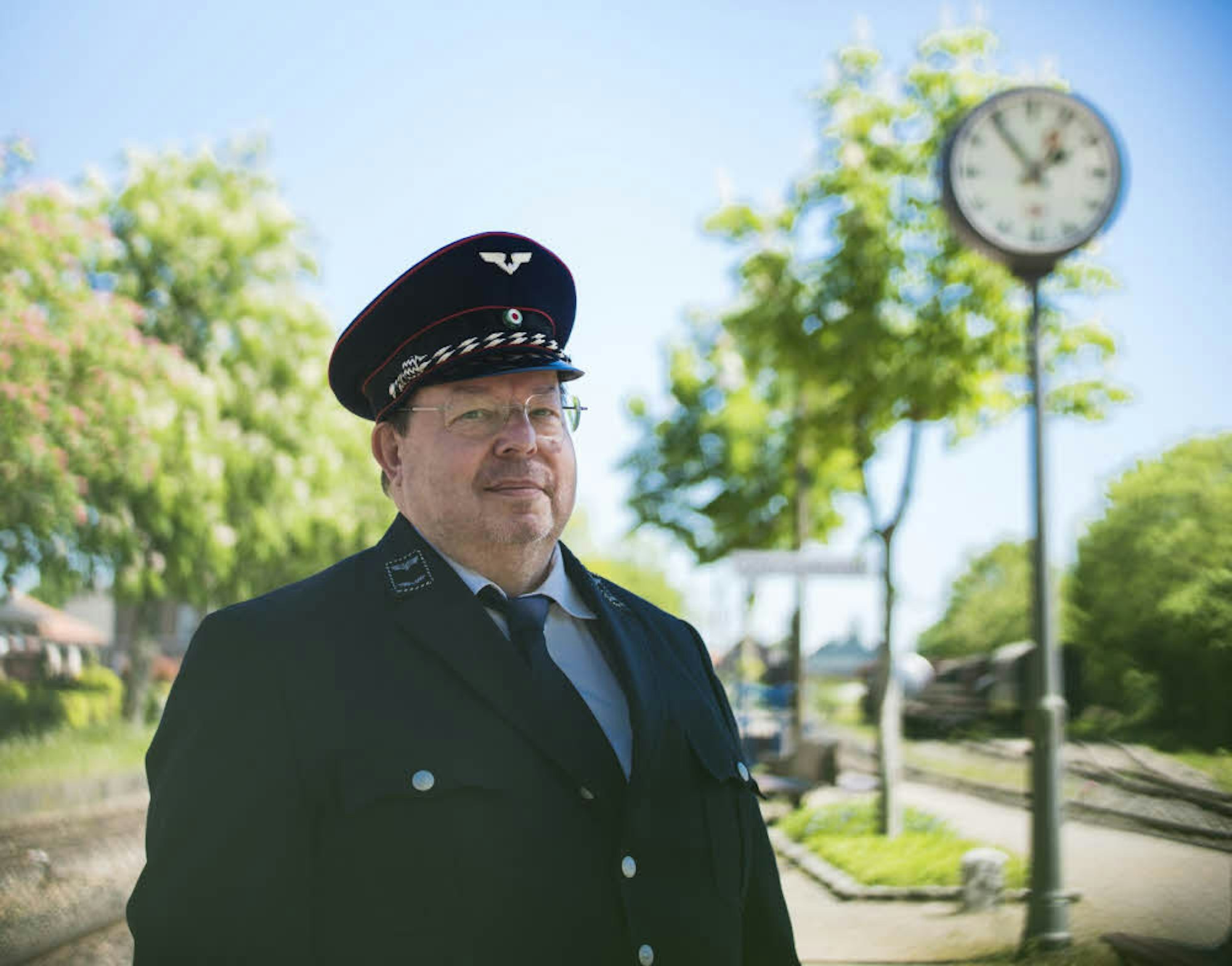 Detlef Böttcher verkauft in glattgebügelter Eisenbahneruniform Fahrkarten.