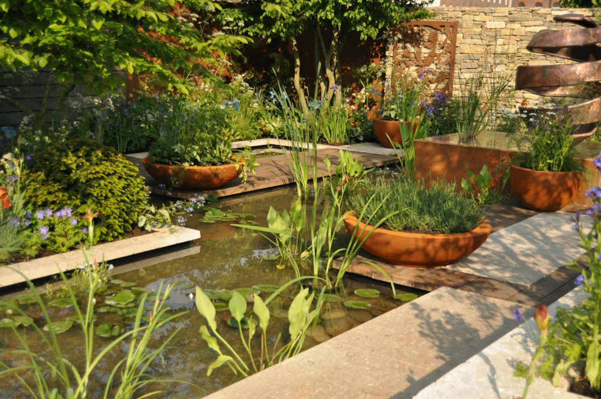 Wasser lässt sich auf vielerlei Art in den Garten integrieren. Meditativ wirken große, flache Becken mit still stehendem Wasser. Designer David Neale fasst sie mit Steinplatten und Holzstegen ein.