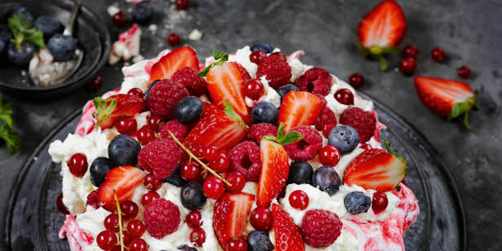 Von Beeren kann es auf einer Torte nicht zu viele geben: Wie bei dieser Pavlova-Torte mit Erd-, Him-, Johannis- und Blaubeeren.