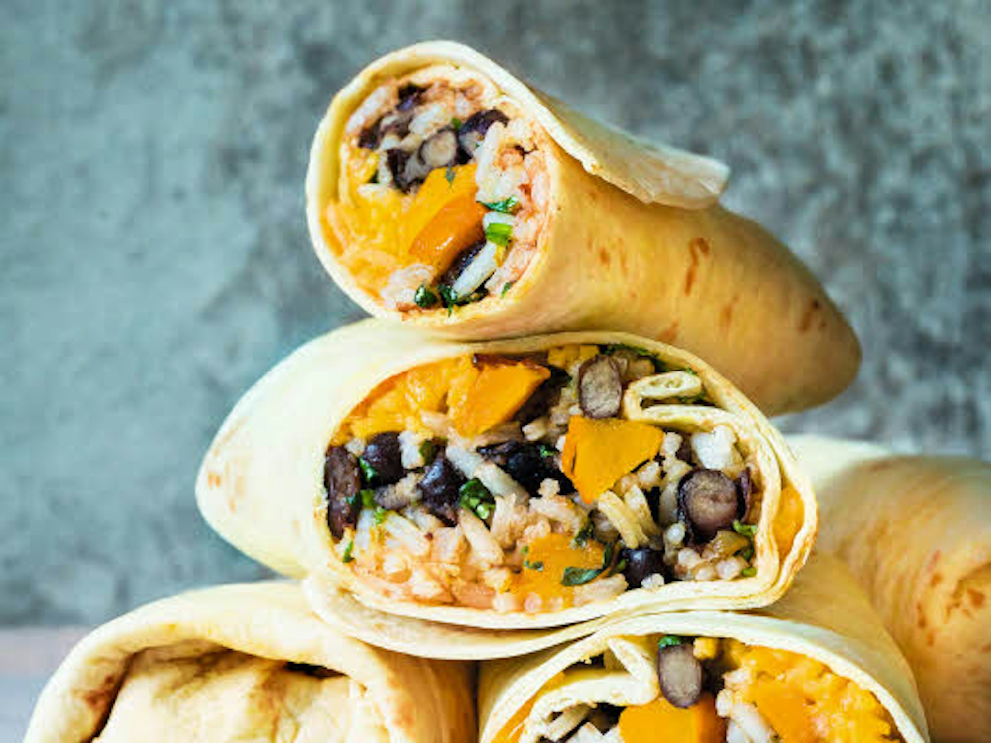 Burritos lassen sich auch vegetarisch füllen, zum Beispiel mit Kürbis und schwarzen Bohnen.