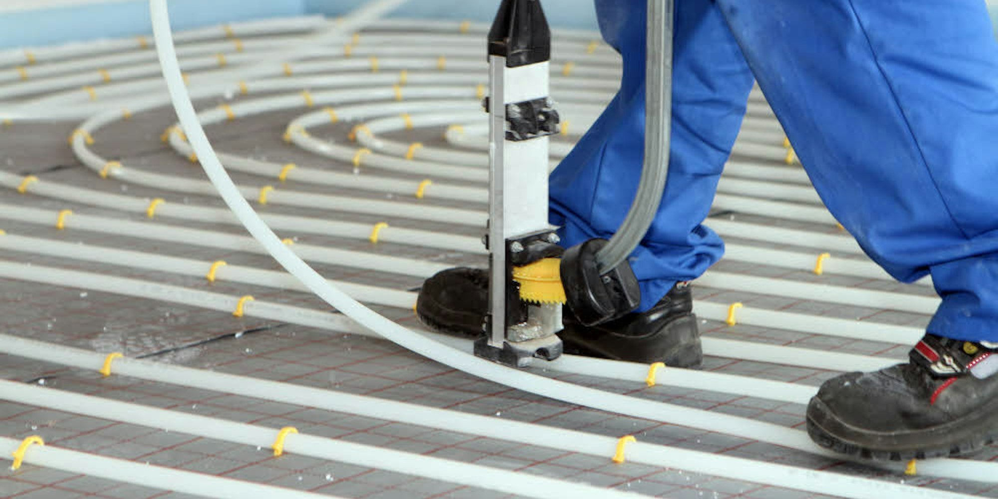 Die Heizrohre einer Fußbodenheizung werden auf der gesamten Fläche eines Raumes verlegt.