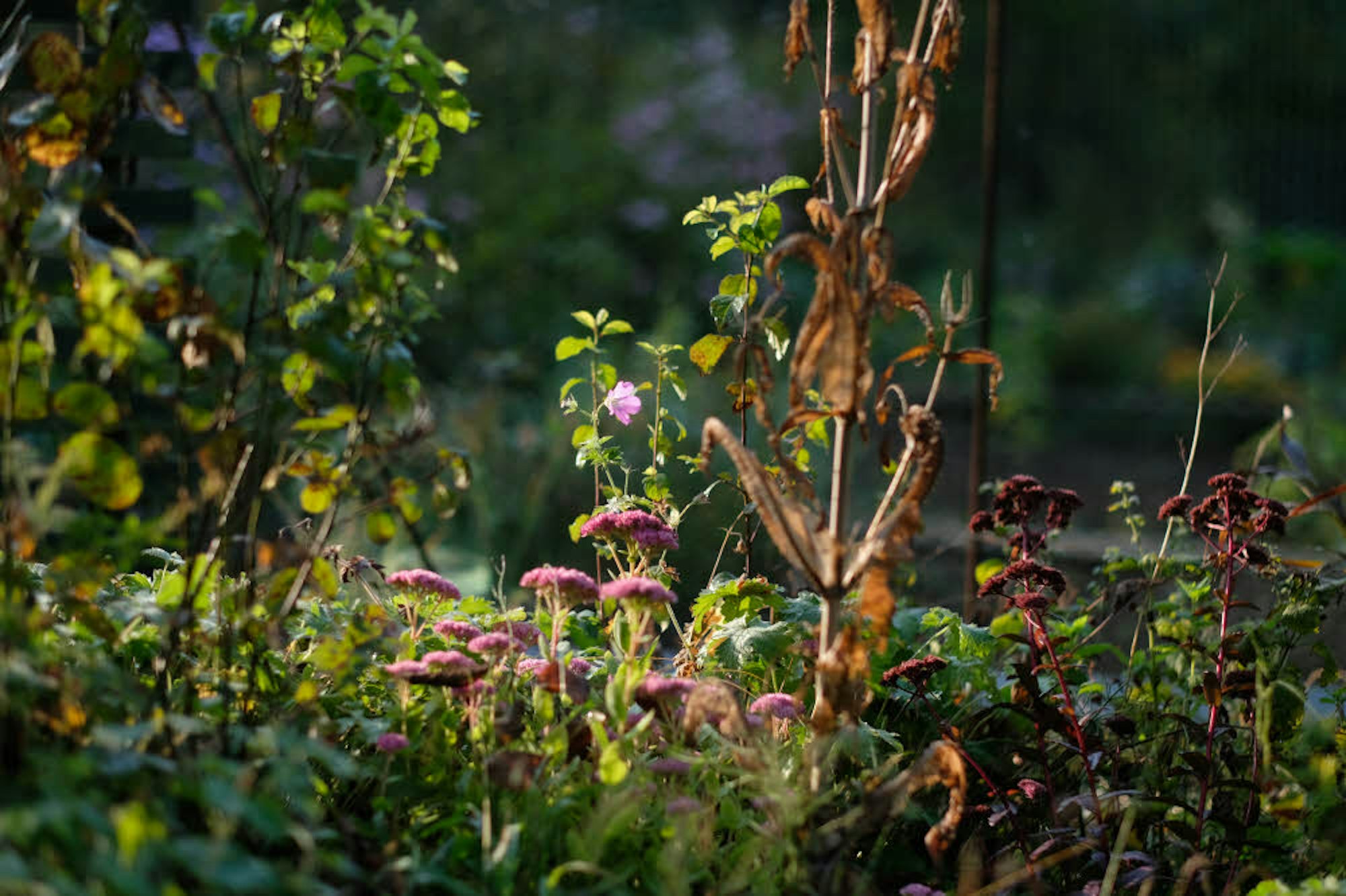 Die Astern haben die Regie übernommen. Vor einem Monat waren es noch die Herbstanemonen, die das Bild bestimmten. Jetzt sind viele von ihnen bereits verblüht, und der Farb-Akzent in den Beeten hat sich ins Bläuliche verschoben. Einen leuchtenden Kontrast dazu bilden die gelben und samtig roten Tagetes und die fast neon-orangene Kapuzinerkresse. Hellgelb blühen eine vereinzelte Rose sowie eine Nachtkerze, die sich in diesem Jahr einen Platz neben der Felsenbirne gesucht hat. Insgesamt aber wird der Garten ruhiger, und wenn sich die Beete lichten, sind es bald wieder eher die Details, die ins Auge fallen.