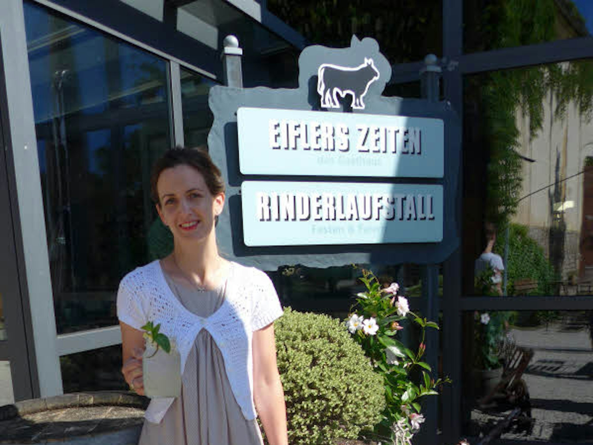 Während Katharina Röder den Service organisiert und als Sommelière für die Weinbegleitung verantwortlich ist, kocht Ehemann Oliver. Im Gasthaus Eiflers Zeiten geht es bodenständig zu. „Wir orientieren uns mit Vorliebe an traditionellen Eifler Kochkünsten“, sagt Katharina Röder. Beliebt ist aber auch das „Häppchen Brettchen“ (drei Vorspeisen für 9,90 Euro), eine hauseigene Interpretation von Tapas oder das Wiener Kalbsschnitzel: Dünn geklopft, mit süßem Senf bestrichen und paniert wird es in einer Riesenpfanne ausgebacken und mit Bratkartoffeln, Preiselbeeren sowie einem Salat für 25,90 Euro serviert. Neben Gerichten von einer saisonal geprägten Karte bietet man eine täglich wechselnde Hauptspeise für 15,90 Euro. Das Getränkeangebot umfasst vier Fassbiere (Früh Kölsch, Bitburger Pils, Bitburger Kellerbier und Gemünder Landbier). Unter den angebotenen offenen Weinen finden wir sommerliche Empfehlungen wie Badisch RotGold, eine Mischung aus Spätburgunder und Grauburgunder vom Weinhaus Bettina Schumann aus Bahlingen am Kaiserstuhl oder einen portugiesischen Rotwein aus der Region Bairrada mit dem Namen Nat´Cool, der kalt getrunken wird. Eine erfrischende Alternative nicht nur an heißen Tagen sind hausgemachte Limonaden in Geschmacksrichtungen wie Orange-Limette, Birne-Basilikum oder Zitrone-Holunder.