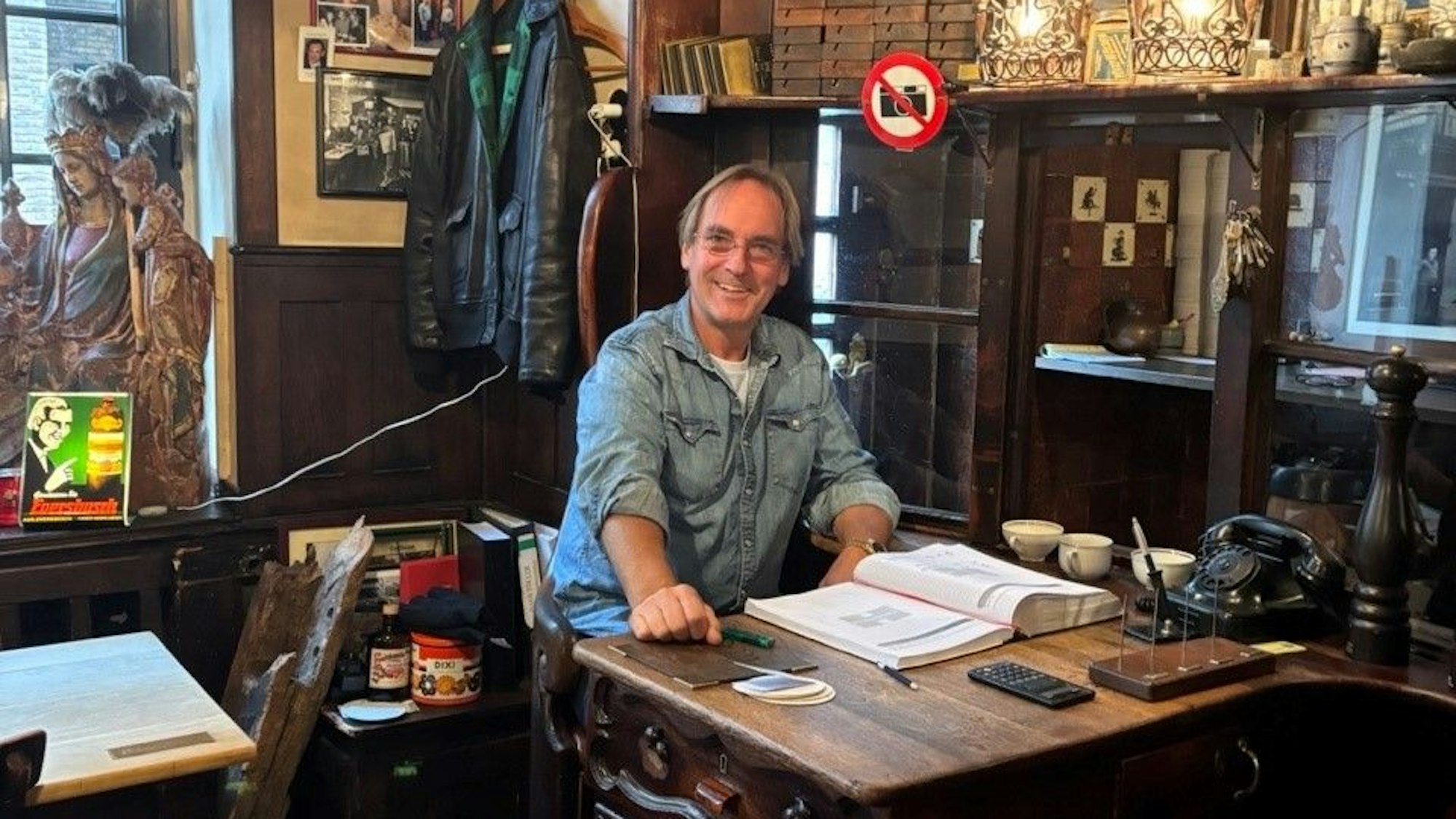 Henning Heuser führt das Lokal seit 2003. Seitdem thront er Abend für Abend auf seiner Holzbank. Auf dem sogenannten Thekenschaf in strategisch optimaler Position hat der Hausherr alles im Blick: die Küche, den Ausschank und auch den Eingang. Schließlich erhält nicht jeder einen Platz, der um Einlass bittet. „Es kann schon vorkommen, dass ich jemanden wegschicke und das liegt nicht immer daran, dass alle Plätze belegt sind“, sagt Heuser. Wer die kleine Hürde überwunden hat, wird reichlich belohnt. Das beginnt mit der Kulisse, für die das Wort „urig“ erfunden zu sein scheint. So viel Kölsche Historie in einem Lokal ist selten. Alleine die zahlreichen Fotos mit ehemaligen und aktuellen Stammgästen geben einen guten Einblick in die bewegte Geschichte des Lokals. Lampen von 1942, Tischplatten aus einer Mischung von Weißbuche und Akazie, Tonet Stühle oder die Kölner Kassettendecke sind nur einige von unzähligen Details, die die besondere Atmosphäre ausmachen.