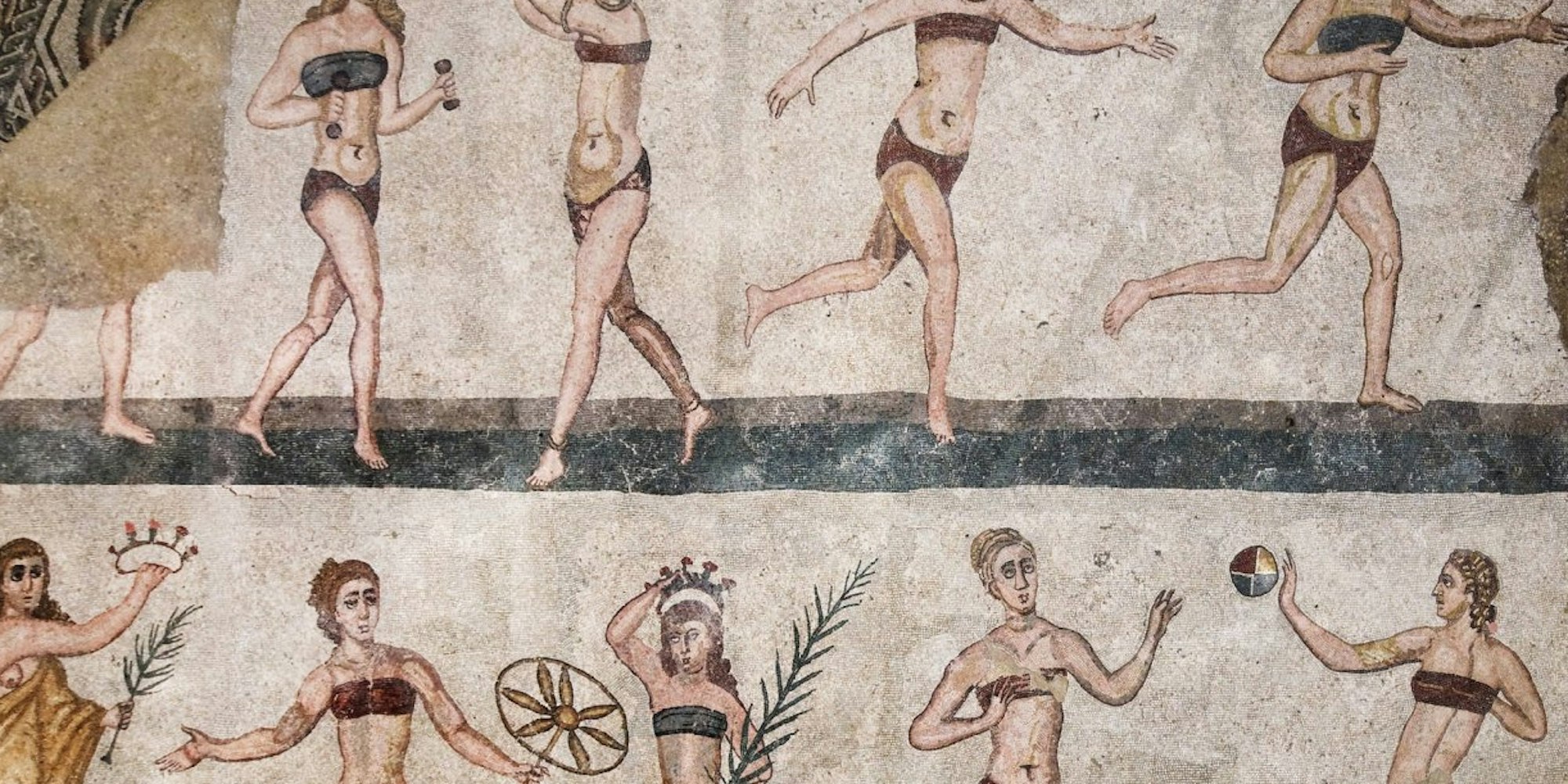 Ein reicher römischer Aristokrat soll im vierten Jahrhundert auf dem Mosaik gewohnt haben, das eines der zahlreichen Räume seines Anwesens schmückte. Es zeigt zehn junge Frauen in sportlichen Posen. Eine Diskuswerferin, zwei Läuferinnen, zwei Ballspielerinnen, eine Weitspringerin mit Hanteln und die Szene einer Siegerehrung. Am zerstörten linken Oberrand war wohl einmal eine Speerwerferin zu sehen. „In der Öffentlichkeit - zum Beispiel auf dem Marsfeld - durften Frauen keinen Sport treiben“, sagt Weeber. Dort schwitzten vor allem Jünglinge, für die die körperliche Ertüchtigung zur militärischen Ausbildung gehörte.