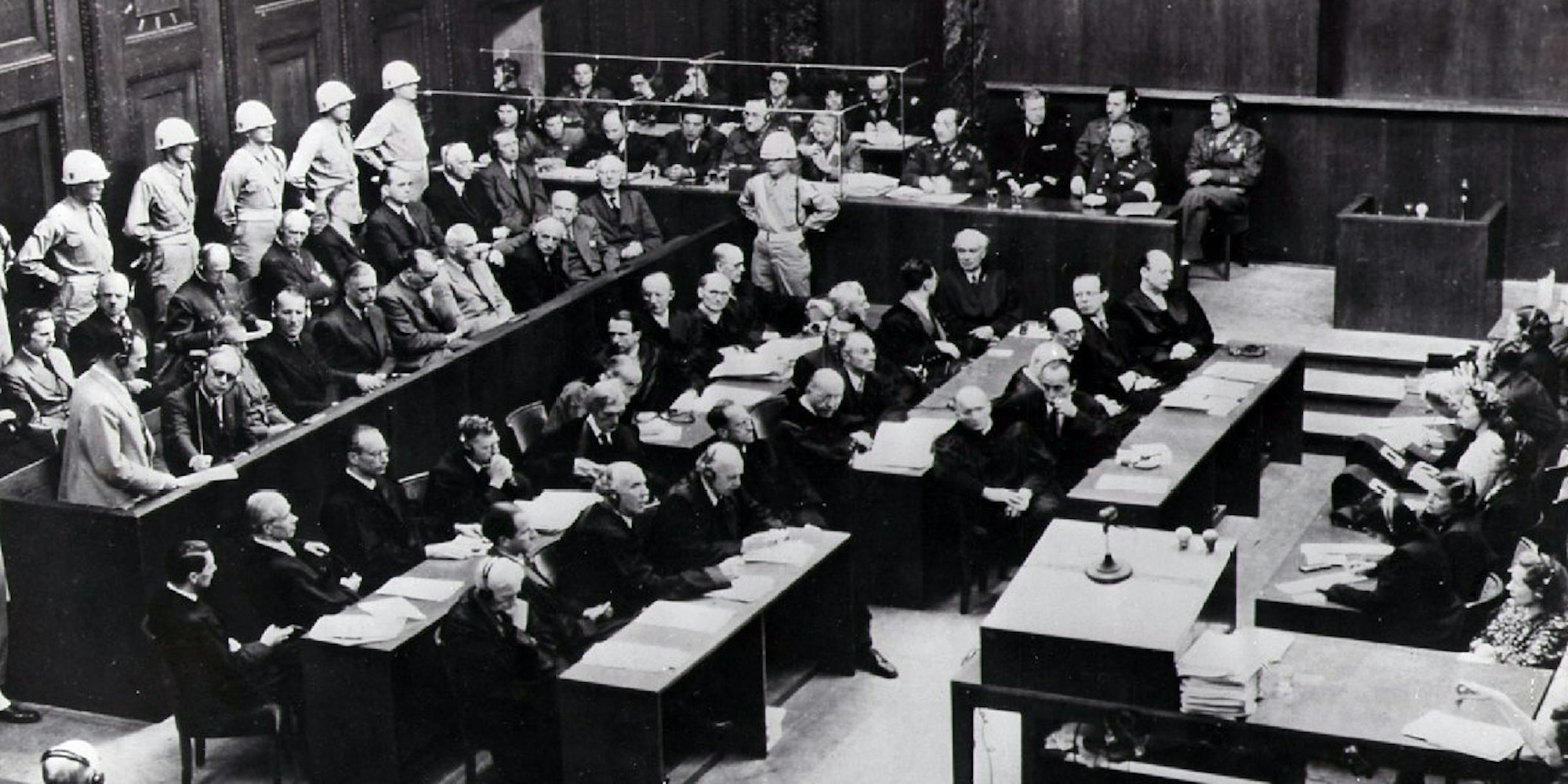 Blick in den Verhandlungssaal der Nürnberger-Prozesse (Archivbild von 1945). Am 20. November 1945 fand die Eröffnungssitzung des Internationalen Militärgerichts in Nürnberg statt. Bei den Prozessen saßen von 1945 bis 1946 führende Vertreter des NS-Regimes auf der Anklagebank.