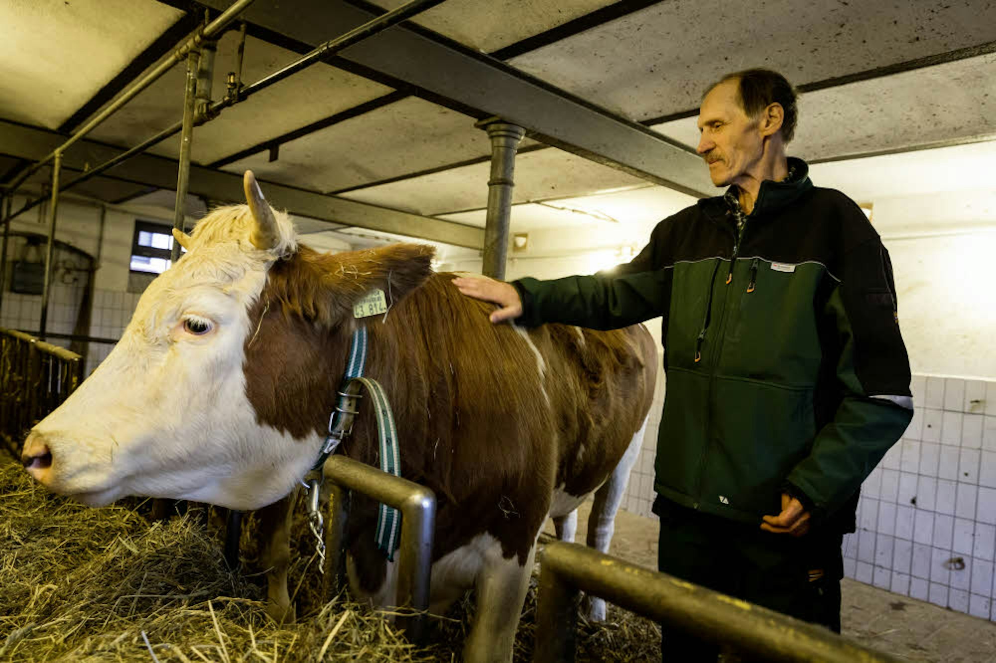 Mit der Heugabel schiebt er den drei jungen Rindern Stroh zu. Dann geht er zu den Hühnern im Nebenraum. 70 braun Gefiederte gackern und stieben auseinander, als er seine schweren Stiefel zwischen ihre Krallen setzt. Degen nimmt einen grünen Eimer und legt behutsam die Eier aus den Nestboxen hinein. Ohne Mühen packt er ein Huhn. In seinen Händen beruhigt sich der Vogel sogleich. Ein kleines Lächeln umspielt seine Lippen. „Macht Spaß“, sagt er.