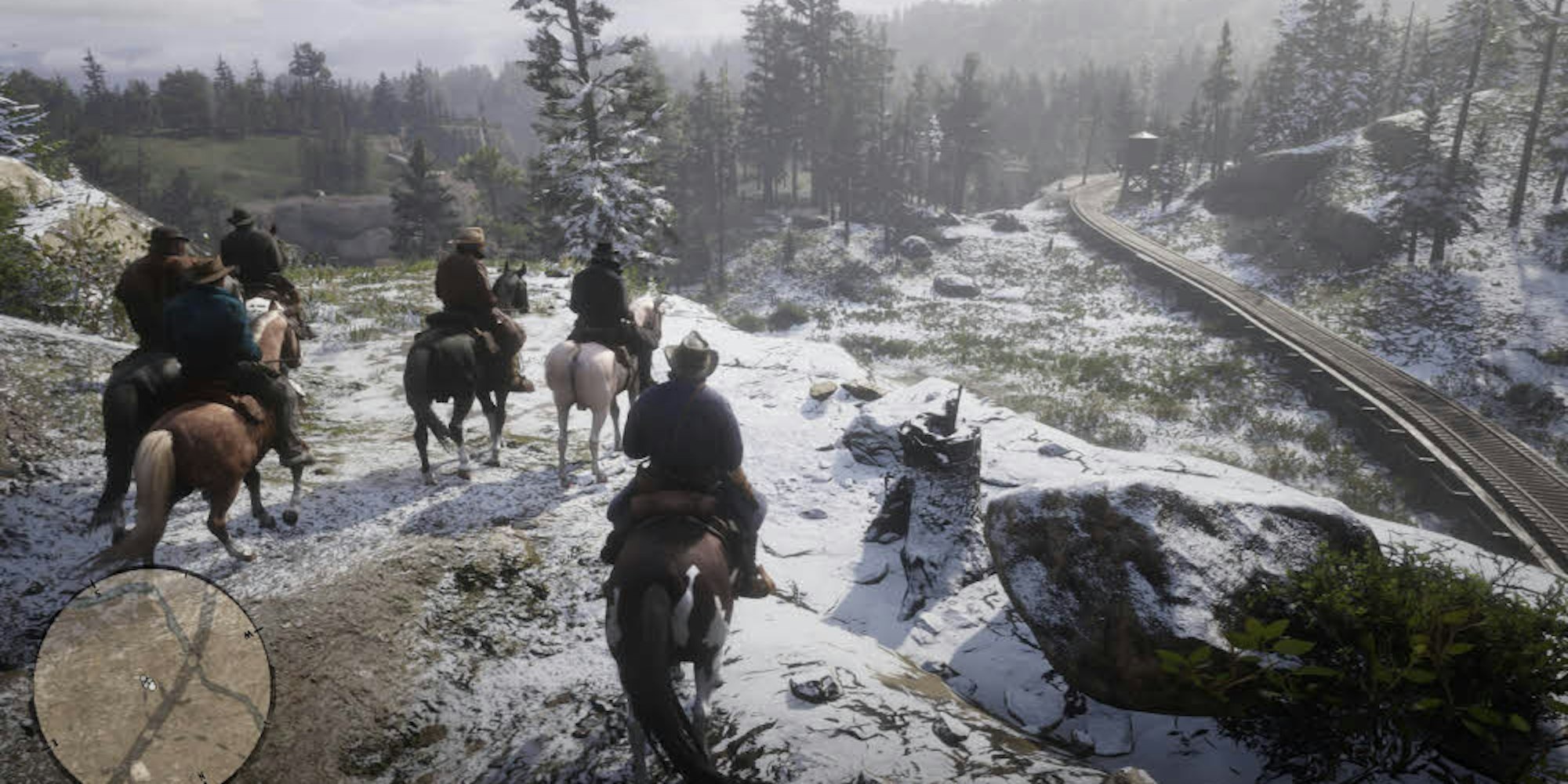 Vor den Männern, ganz unten im Tal, scheinen Felsen und Bäume vor dem weißen Untergrund zu schweben. Es ist nicht ganz klar, ob es der Nebel ist, der die Blicke der Reiter auf die Spielzeugwelt trübt, oder die Anstrengungen des Aufstiegs, der kraftraubende Weg durch den tiefen Schnee. In der Ferne steigt Rauch auf. Ein wärmendes Feuer oder eine drohende Gefahr? Gleich zu Beginn wird klar, wohin die Reise geht. Stumpfe Action wird hier nicht geboten. Sinnfrei ballern kann man woanders. Stattdessen öffnet sich die Tür in eine andere Dimension. „Red Dead Redemption 2“, die Fortsetzung der Western-Saga von Rockstar Games, in ein begehbares Kunstwerk.